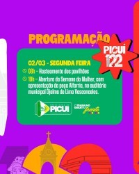 19h – Abertura da Semana da Mulher, com apresentação da peça Alforria, no Auditório Municipal Djalma de Lima Vasconcelos.