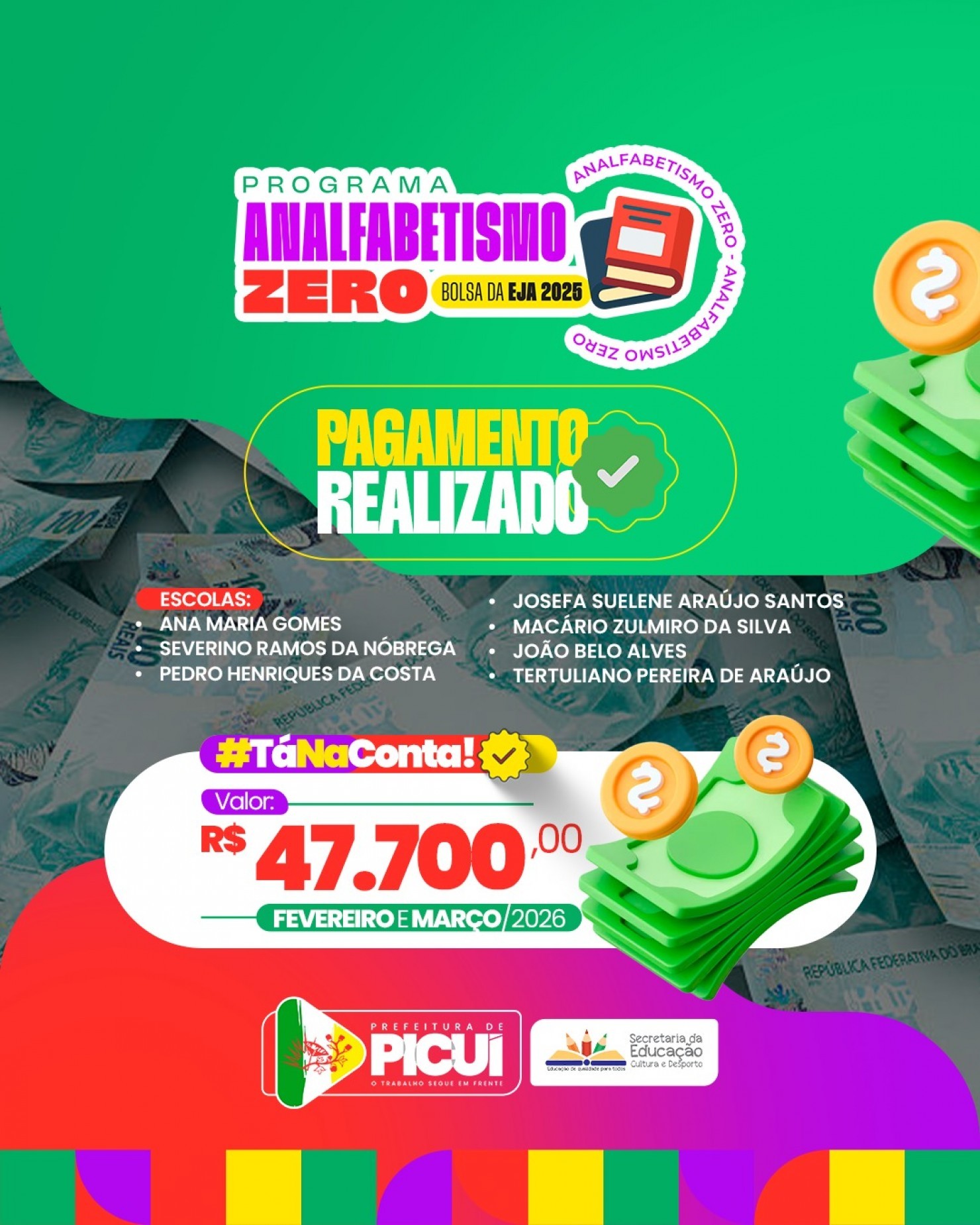 Nos meses de fevereiro e março, a gestão municipal O Trabalho segue em Frente destinou um total de R$ 47.700,00 em bolsas de incentivo para alunos da EJA. Em fevereiro, o investimento foi de R$ 24.100,00, enquanto em março o valor chegou a R$ 23.600,00. Ao todo, mais de 230 estudantes foram beneficiados com o programa.