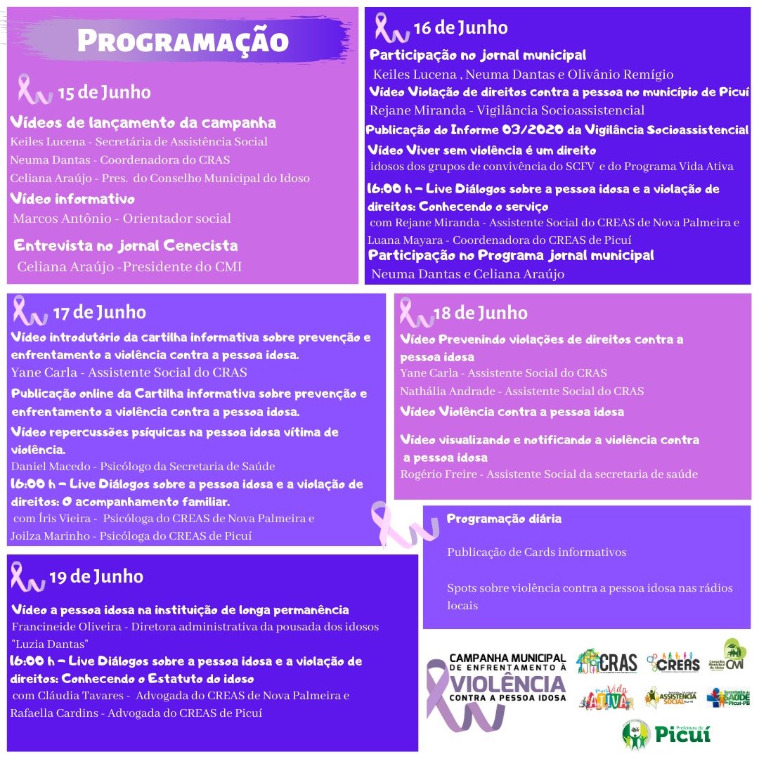 Vale ressaltar a importância da população participar dessa campanha, que este ano acontece online, nos canais oficiais de comunicação do CRAS, CREAS e da Assistência Social. Veja, a seguir, a programação completa dessa relevante campanha pela garantia de direitos da pessoa idosa.