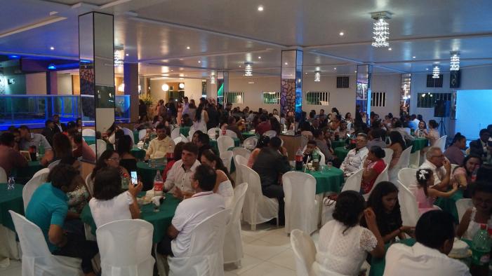 O local escolhido foi todo decorado para que o momento ficasse marcado na vida dos noivos com direito a bolo de casamento e fotografia dos casais nas mesas para ficar como lembrança do momento tão especial. Cada detalhe foi pensado para a realização do evento.