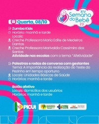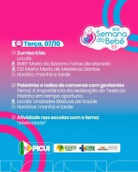 Na manhã de ontem (06), as escolas da Rede Municipal de Ensino de Picuí estiveram reunidas para celebrar o início da XIV Semana Municipal do Bebê, uma iniciativa que visa garantir um começo de vida mais saudável e feliz para as crianças do município. Durante os próximos dias, ações, palestras e atividades serão realizadas para promover a saúde, o bem-estar e o desenvolvimento das crianças.