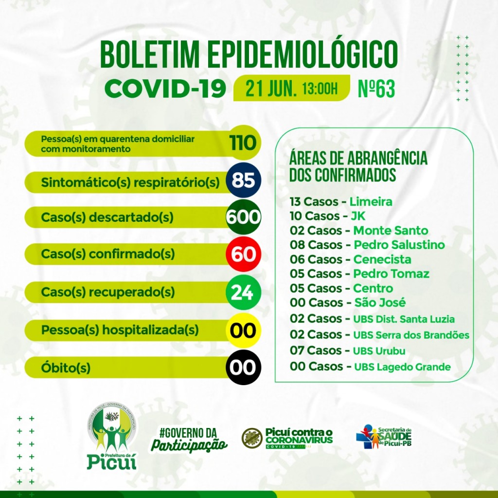 Segundo a responsável pela Vigilância Epidemiológica, Airy Lima, o município de Picuí segue, no dia de hoje (21/06), com 60 casos confirmados, no total, e há cerca de 24 pessoas que estão recuperadas da doença.