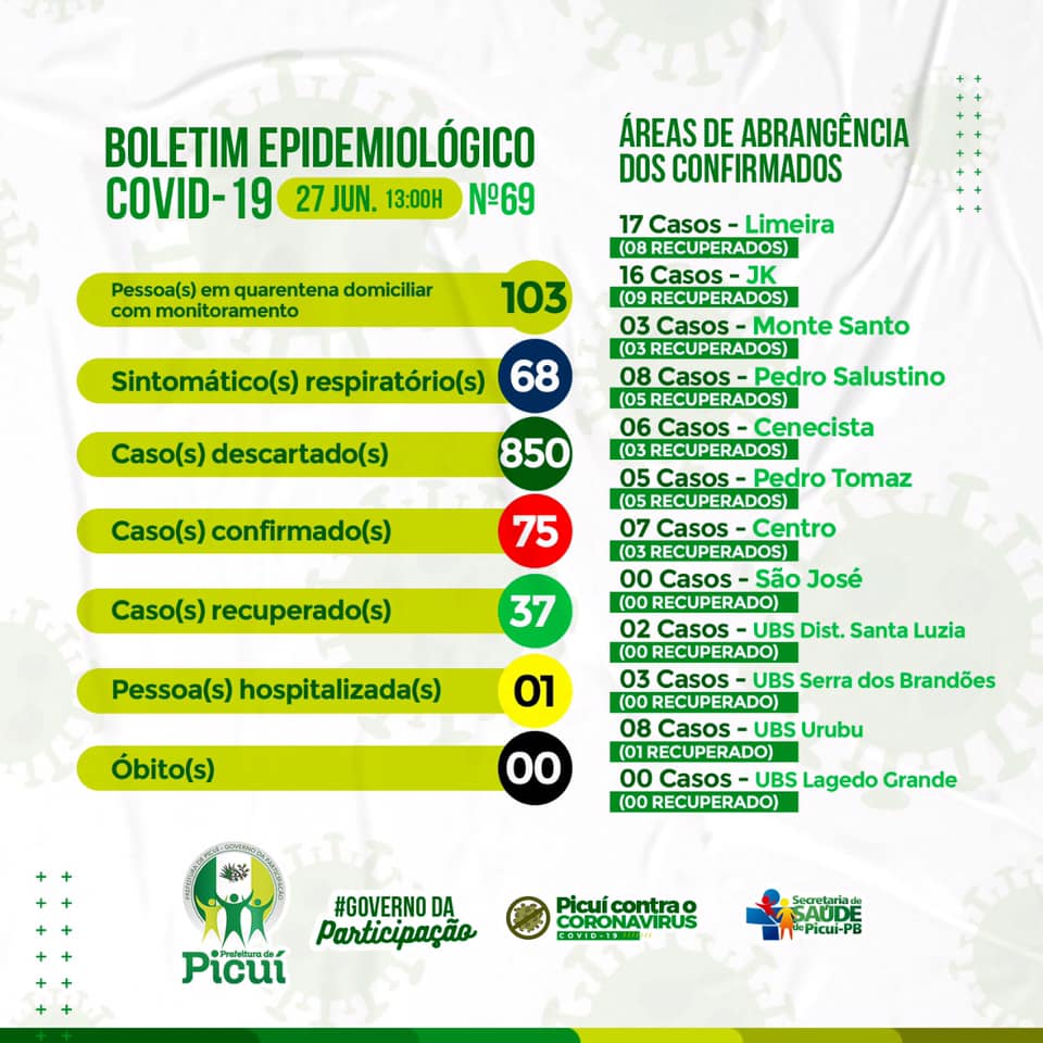 Picuí segue, no dia de hoje (27/06), com 75 casos confirmados, no total, e há cerca de 37 pessoas que estão recuperadas da doença, segundo a Vigilância Epidemiológica. 103 pessoas estão em quarentena domiciliar com o monitoramento das Equipes de Estratégia de Saúde da Família e cerca de 68 casos estão sintomáticos respiratórios (síndrome gripal) com os sintomas de febre, coriza, tosse, dor de garganta e que foram registrados pelas equipes de saúde. 850 casos foram descartados a partir dos resultados apresentados na realização do teste rápido com os profissionais de saúde, servidores públicos e/ou pessoas que apresentaram algum sintoma gripal e uma pessoa encontra-se hospitalizada. O município não registrou nenhum óbito da doença.