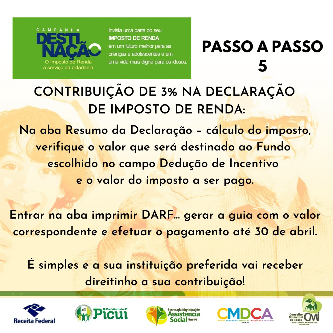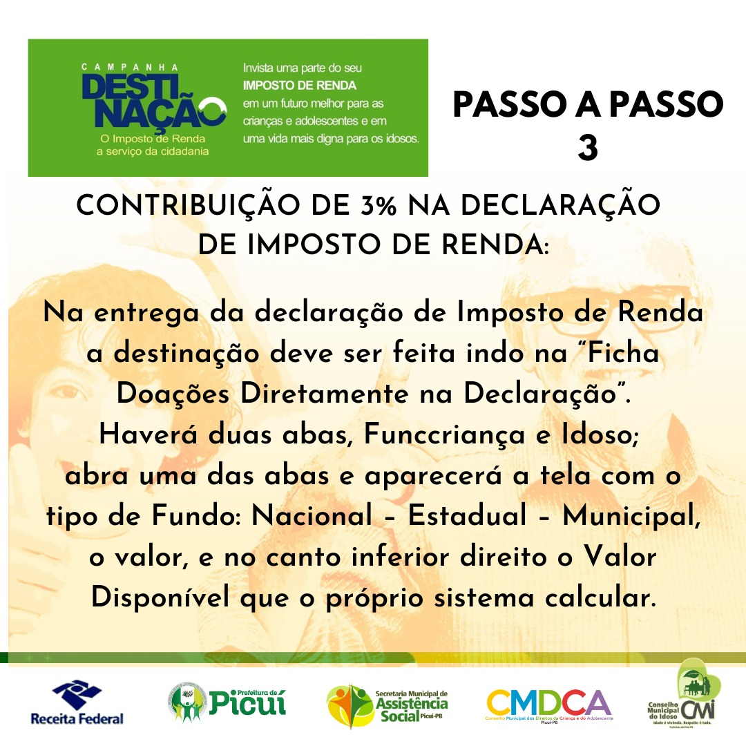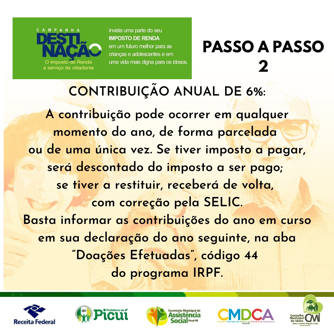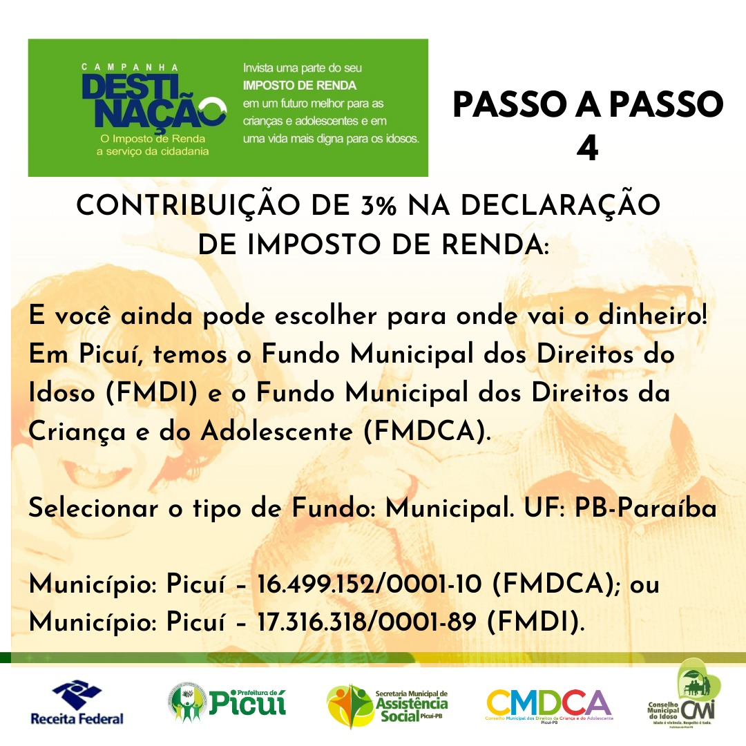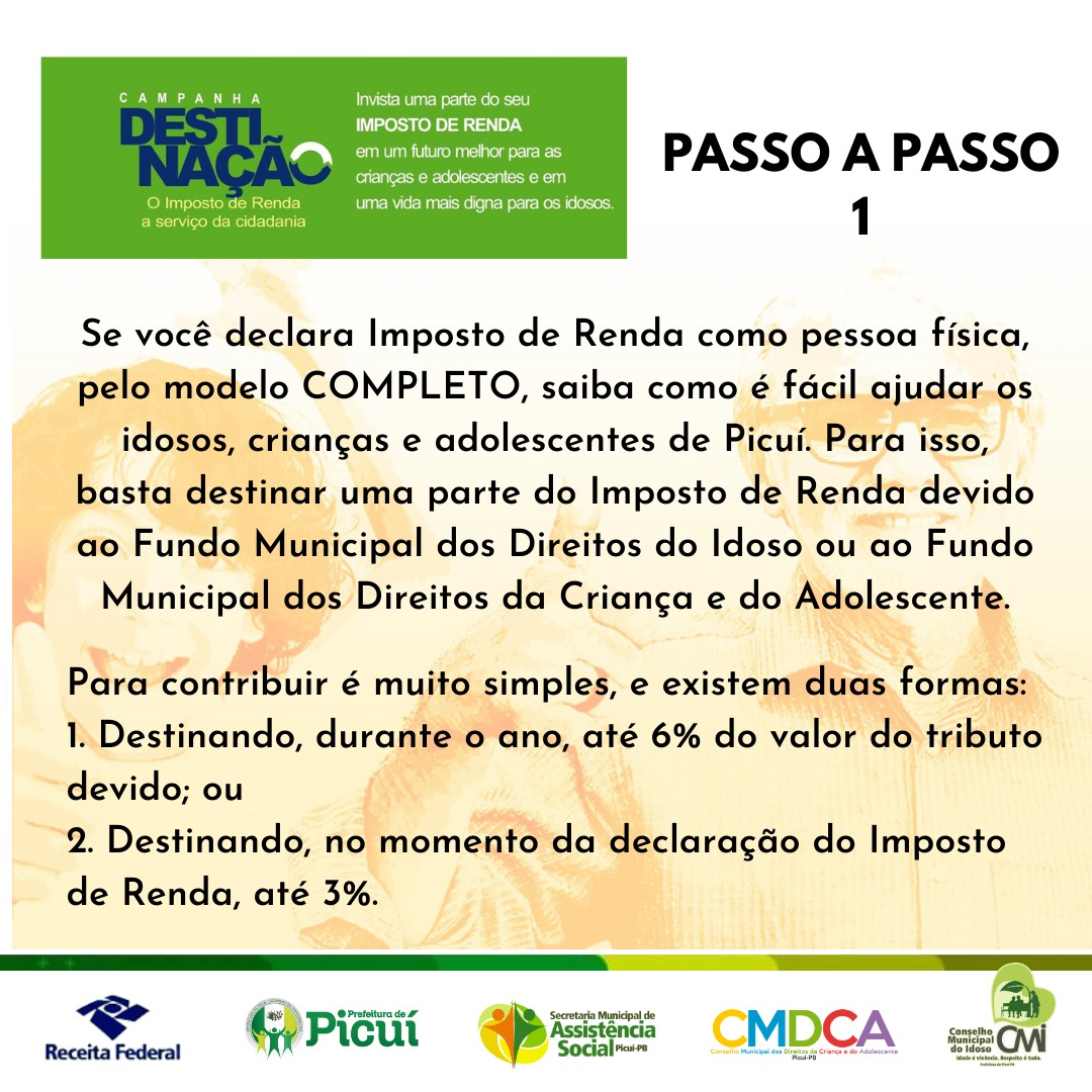 A Prefeitura Municipal de Picuí - Governo da Participação está realizando, em parceria com a Receita Federal, a Campanha Municipal de Destinação, em que, ao declarar o Imposto de Renda como pessoa física, pelo modelo COMPLETO, é consideravelmente simples contribuir com os idosos, as crianças e os adolescentes do município. Para isso, basta destinar uma parte do Imposto de Renda devido ao Fundo Municipal dos Direitos do Idoso ou ao Fundo Municipal dos Direitos da Criança e do Adolescente. Confira o passo a passo, a seguir: