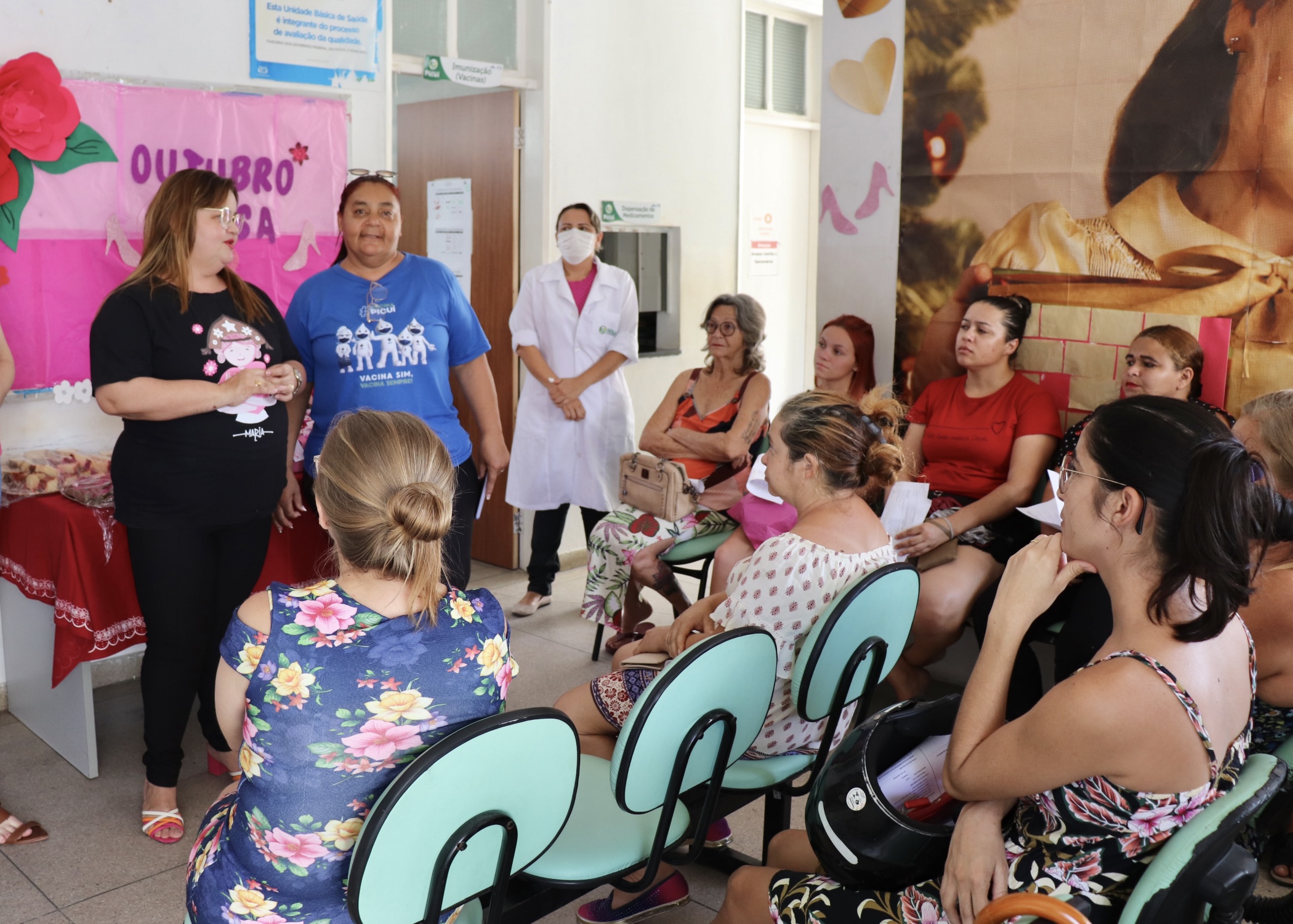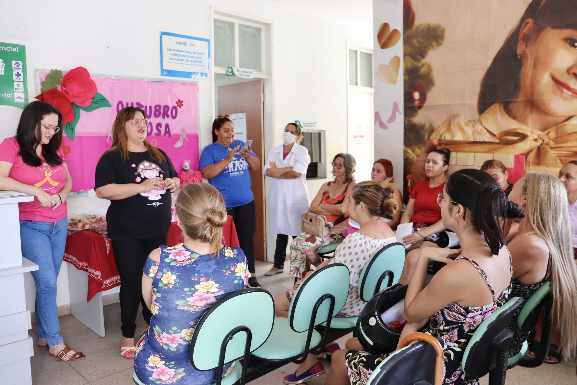 Na tarde de ontem (20), a Prefeitura Municipal de Picuí, por meio da Secretaria de Saúde, promoveu um momento no Centro de Saúde para tratar acerca da Campanha Outubro Rosa, na conscientização para a prevenção ao Câncer de Mama, com a equipe profissional de Saúde da Família para as mulheres do centro e do bairro São José atendidas nesta Unidade Básica de Saúde.