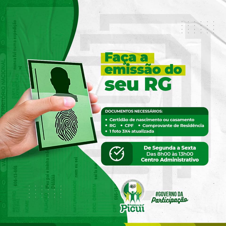 A Prefeitura Municipal de Picuí - Governo da Participação, por meio da Secretaria de Administração, através do setor de Identificação vem a público comunicar que, para além dos documentos necessários para tirar o RG, você poderá levar, de forma opcional, os seguintes documentos para acrescentar ao RG: Cartão do SUS; Tipo Sanguíneo; NIS/PIS/PASEP; Título Eleitoral; CNH (Carteira Nacional de Trânsito); CTPS/SERIE/UF (Carteira de Trabalho); Certificado Militar (Reservista); Identidade Profissional. Vale ressaltar que o setor de Identificação do município de Picuí está funcionando sempre de segunda à sexta-feira, das 8 às 13 horas, com um agendamento e triagem inicial, em virtude da pandemia de COVID-19.