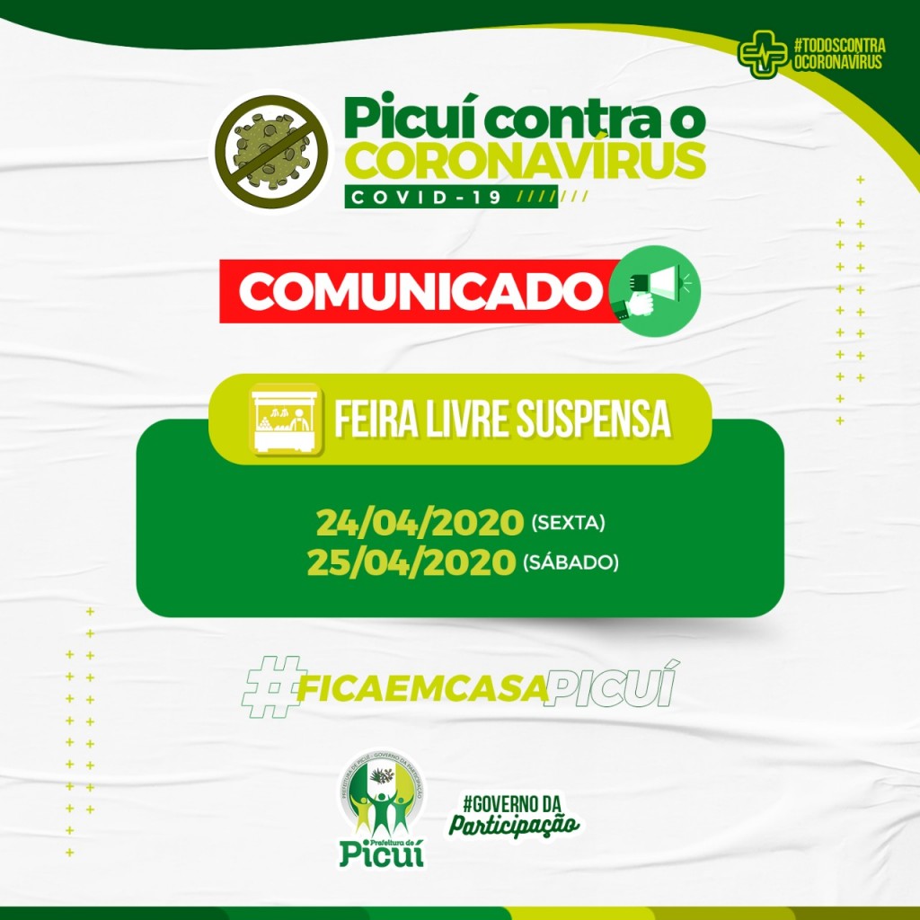 A Prefeitura Municipal de Picuí, através do Governo da Participação, vem a público comunicar a suspensão temporária da Feira Livre que é realizada aos sábados, no município.