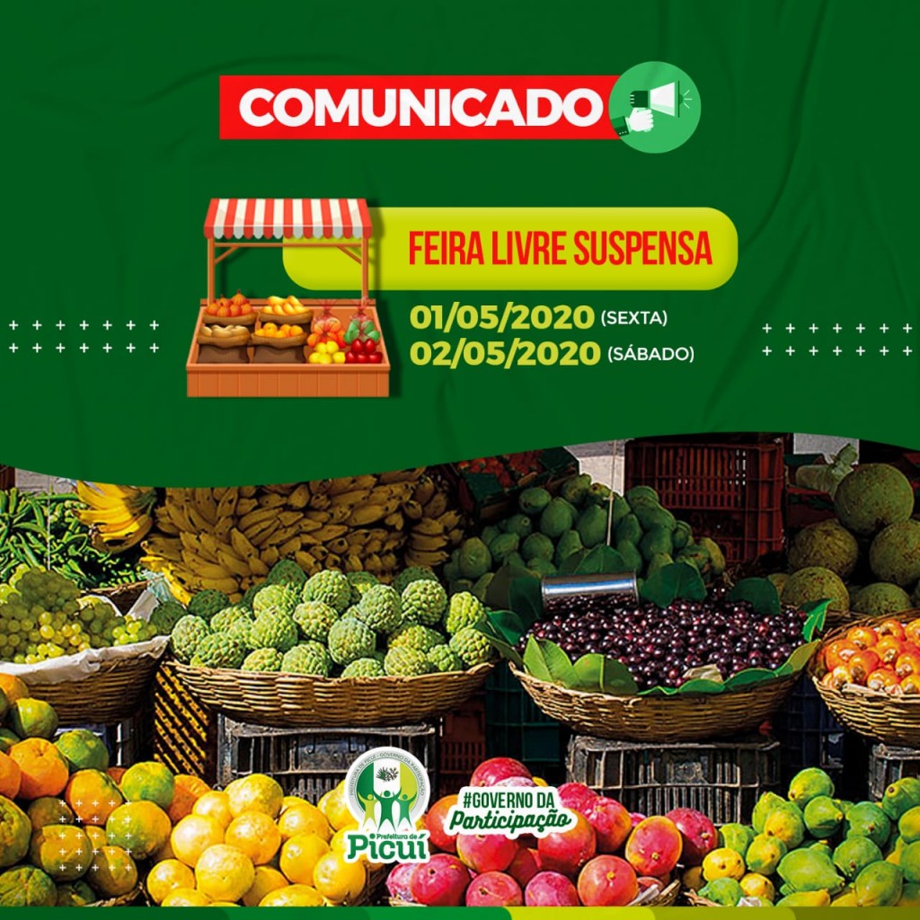 A Prefeitura Municipal de Picuí, através do Governo da Participação, vem a público comunicar a suspensão temporária da Feira Livre que seria realizada na próxima sexta-feira (01) e sábado (02), no município, diante do considerável aumento de casos de COVID-19 no estado da Paraíba.