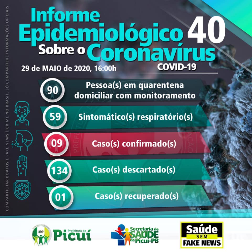 O município de Picuí registra, no dia de hoje (29), o nono caso confirmado de COVID-19. 1 paciente está totalmente recuperado e cerca de 90 pessoas seguem em isolamento domiciliar com o monitoramento das Equipes de Estratégia de Saúde da Família.