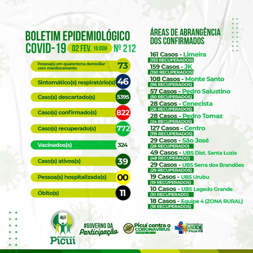 De acordo com informações fornecidas pela Vigilância Epidemiológica, Picuí registra nesta terça-feira (02/02), 822 casos confirmados, sendo 39 ativos, e há cerca de 772 pessoas que estão recuperadas da doença. 73 pessoas estão em quarentena domiciliar com o monitoramentos das Equipes de Estratégia de Saúde da Família e cerca de 46 casos estão sintomáticos respiratórios (síndrome gripal) com os sintomas de febre, coriza, tosse, dor de garganta e que foram registra dos pelas equipes de saúde. O município tem cerca de 11 mortes ocasionadas pelo coronavírus. 5395 casos foram descartados a partir dos resultados apresentados na realização do teste rápido com os profissionais de saúde, servidores públicos e/ou pessoas que apresentaram algum sintoma gripal. Com a campanha de imunização contra a COVID-19, o município tem vacinado cerca de 324 pessoas nesta primeira fase.
