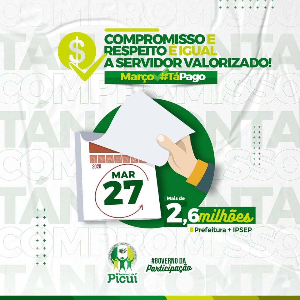 Compromisso e respeito é igual a Servidor Público valorizado e a Prefeitura Municipal de Picuí, através do Governo da Participação, está realizando, no dia de hoje (27/03), o pagamento aos servidores públicos municipais e do IPSEP. Estão sendo injetados no município mais 2,6 milhões de reais referentes à terceira folha de pagamento do ano.