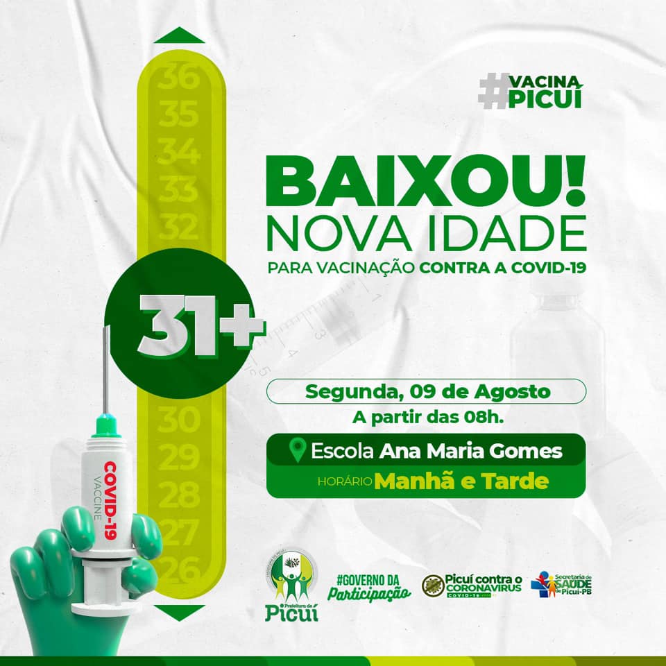 A Prefeitura Municipal de Picuí - Governo da Participação II, por meio da Secretaria de Saúde, vem a público comunicar que a Campanha de Vacinação contra a COVID-19 será realizada por faixa etária nesta segunda-feira (09) contemplando a população a partir de 31 anos. A Campanha de Imunização contra a COVID-19 será realizada na EMEF Ana Maria Gomes, durante o período da manhã e da tarde, a partir das 8 horas.