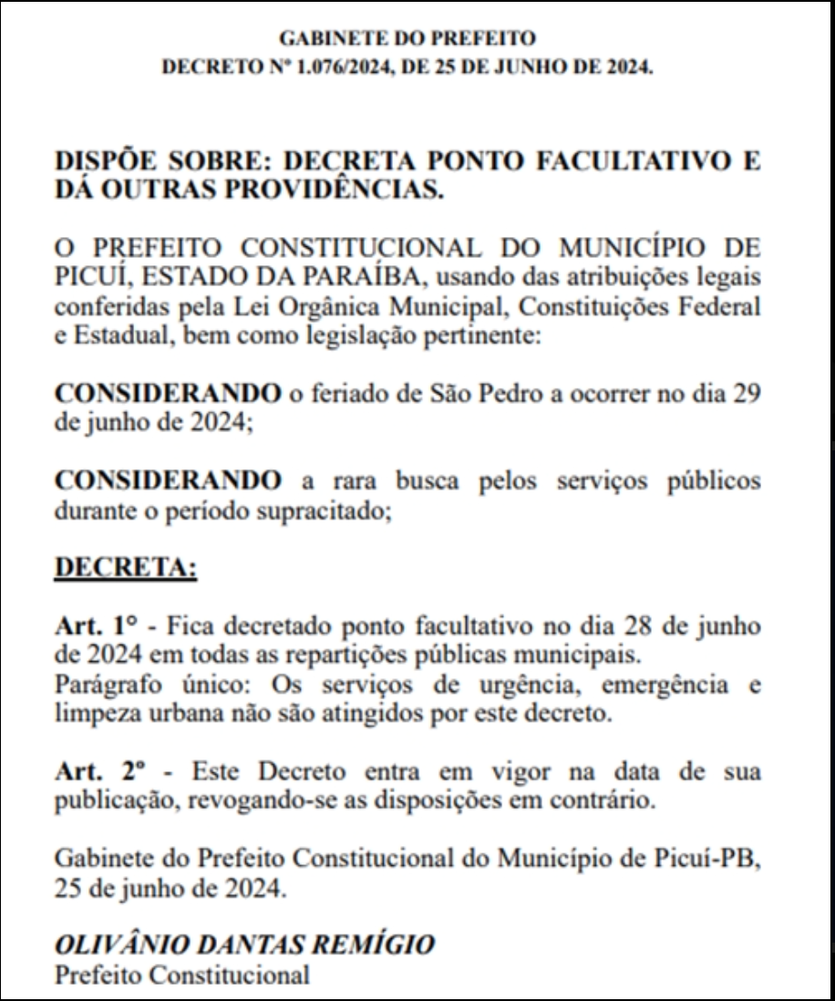Em virtude do feriado de São Pedro ocorrer no sábado, dia 29 de junho, a gestão municipal picuiense Decretou ponto facultativo, nesta sexta-feira, dia 28, em todas as repartições públicas municipais, com exceção dos serviços de urgência, emergência e limpeza pública.