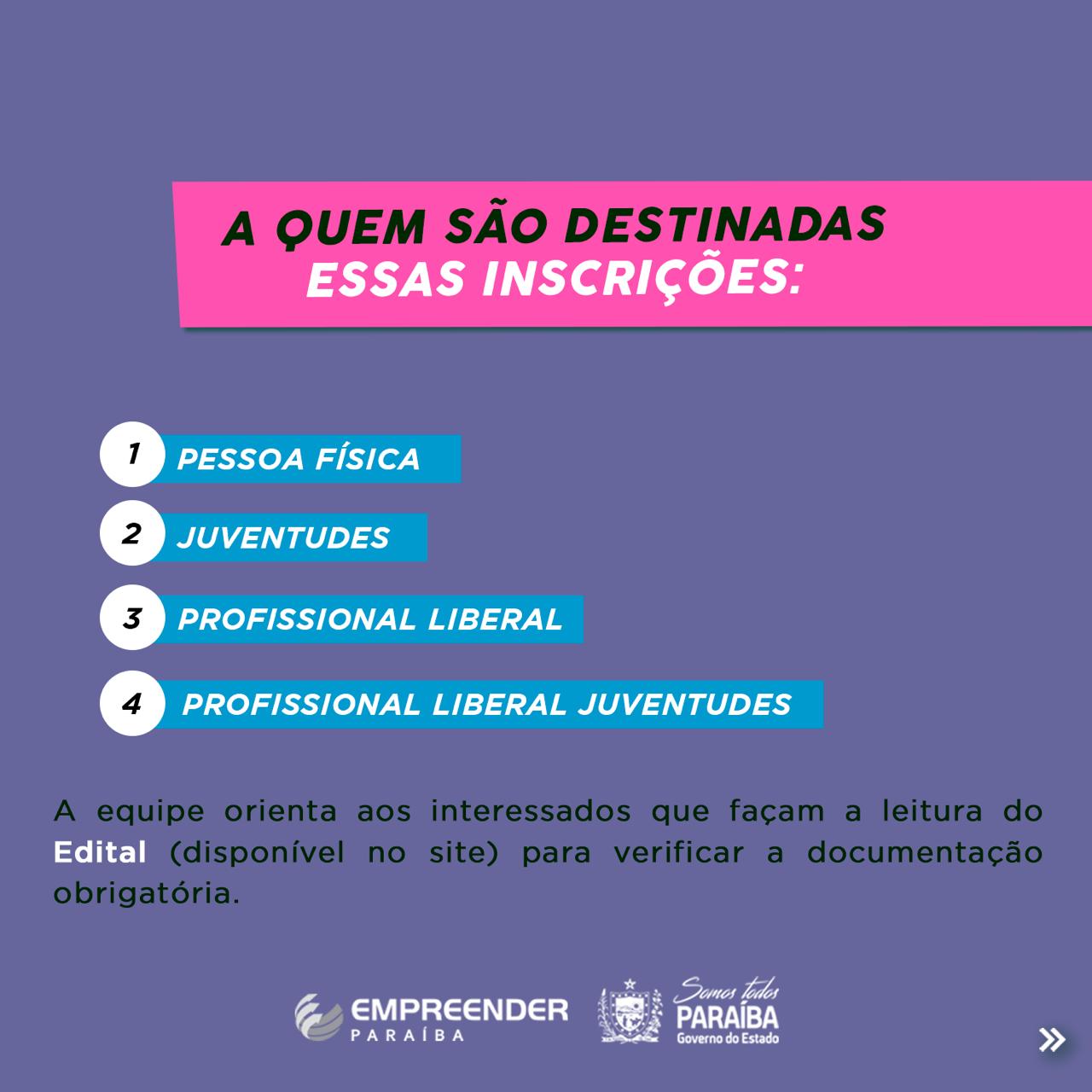 Os interessados devem se inscrever, pontualmente a partir das 8 horas da manhã, pela pagina oficial do Empreender www.empreender.pb.gov.br