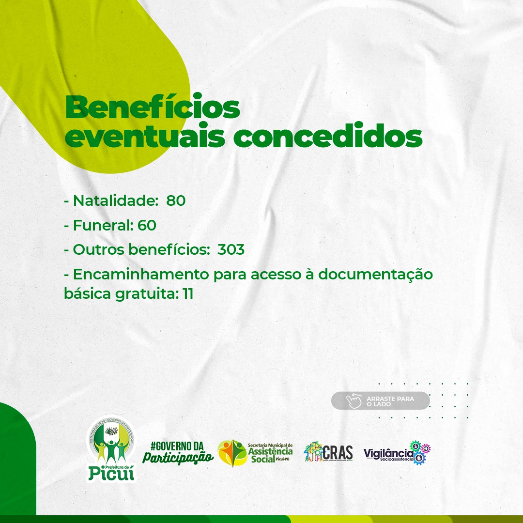 Os benefícios eventuais que foram concedidos, foram cerca de 80 de natalidade, 60 funeral e outros benefícios foram 303. Foram realizados 11 encaminhamentos para acesso à documentação básica gratuita.