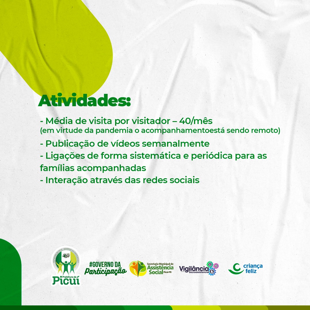 Nesse período, a média de visita por visitador do programa Criança Feliz, por mês, é de 40, pois em virtude da pandemia de COVID-19, como medida preventiva, os atendimentos e acompanhamentos vêm sendo realizados de forma remota). Dentre as atividades realizadas, estão as publicações em redes sociais institucionais da Secretaria de Assistência Social, e nos grupos de WhatsApp, de vídeos socioeducativos semanalmente, os visitadores fazem ligações de forma sistemática e periódica para as famílias acompanhadas pelo PCF, há a interação constante nas redes sociais com as mães e responsáveis dos usuários, em que há 245 pessoas que vem sendo acompanhadas remotamente,