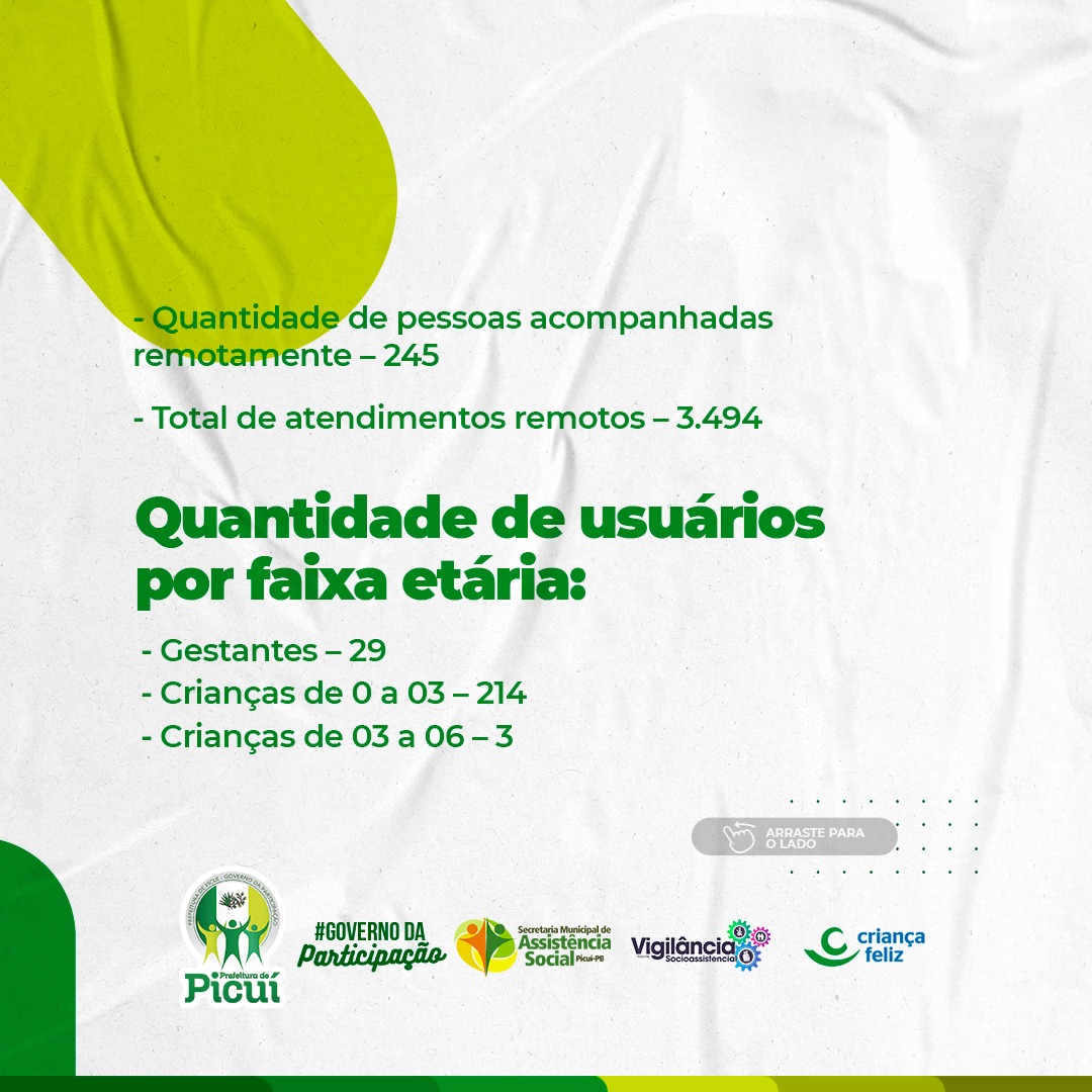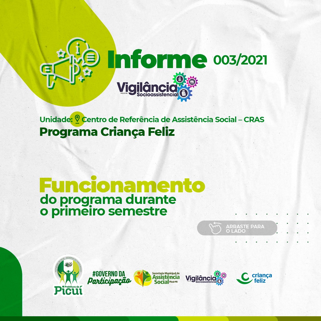 No primeiro semestre de 2021, a Secretaria de Assistência Social tem desenvolvido uma série de atividades e trabalhos em prol da população picuiense, especialmente através do Centro de Referência da Assistência Social - (CRAS), com relação ao funcionamento do Programa Criança Feliz.