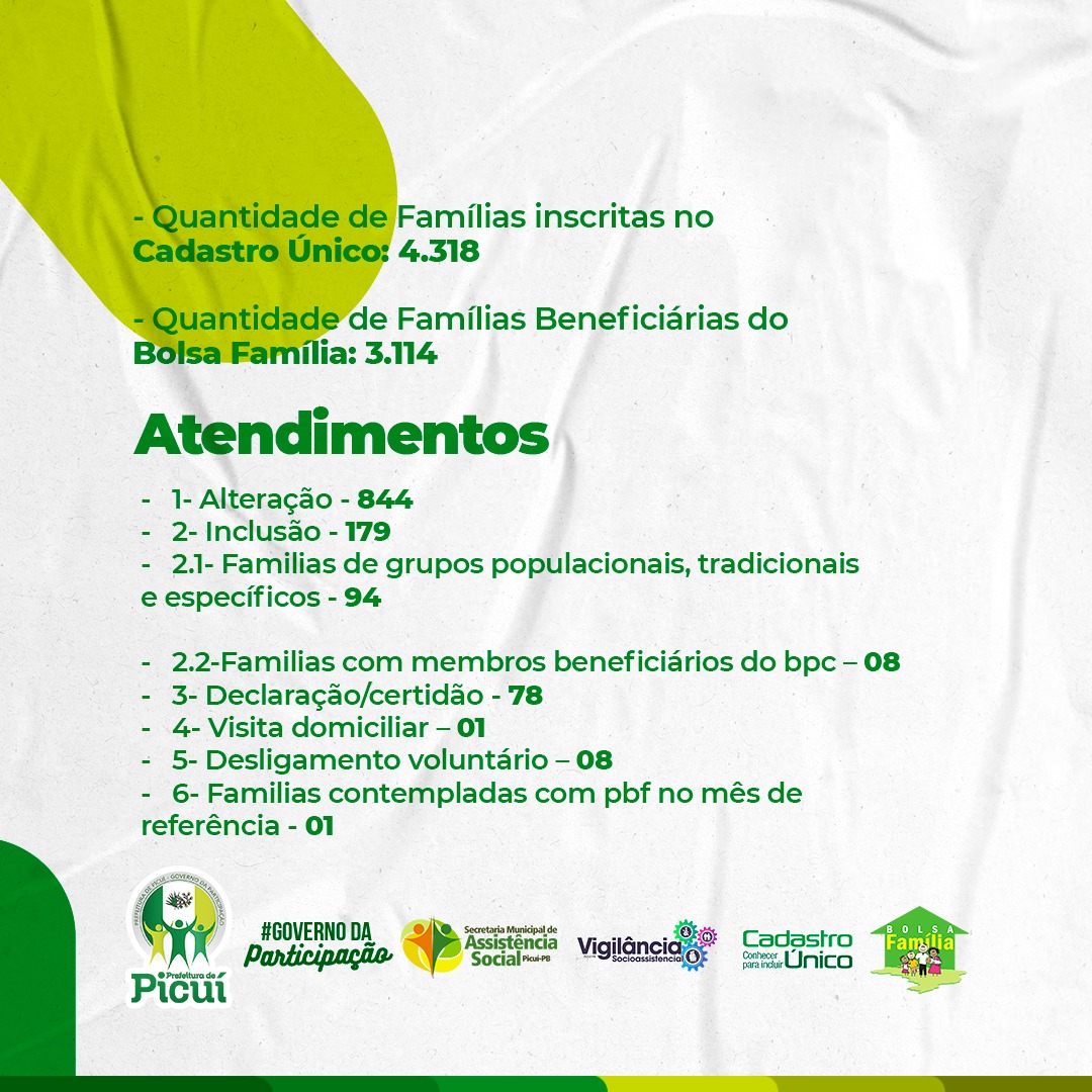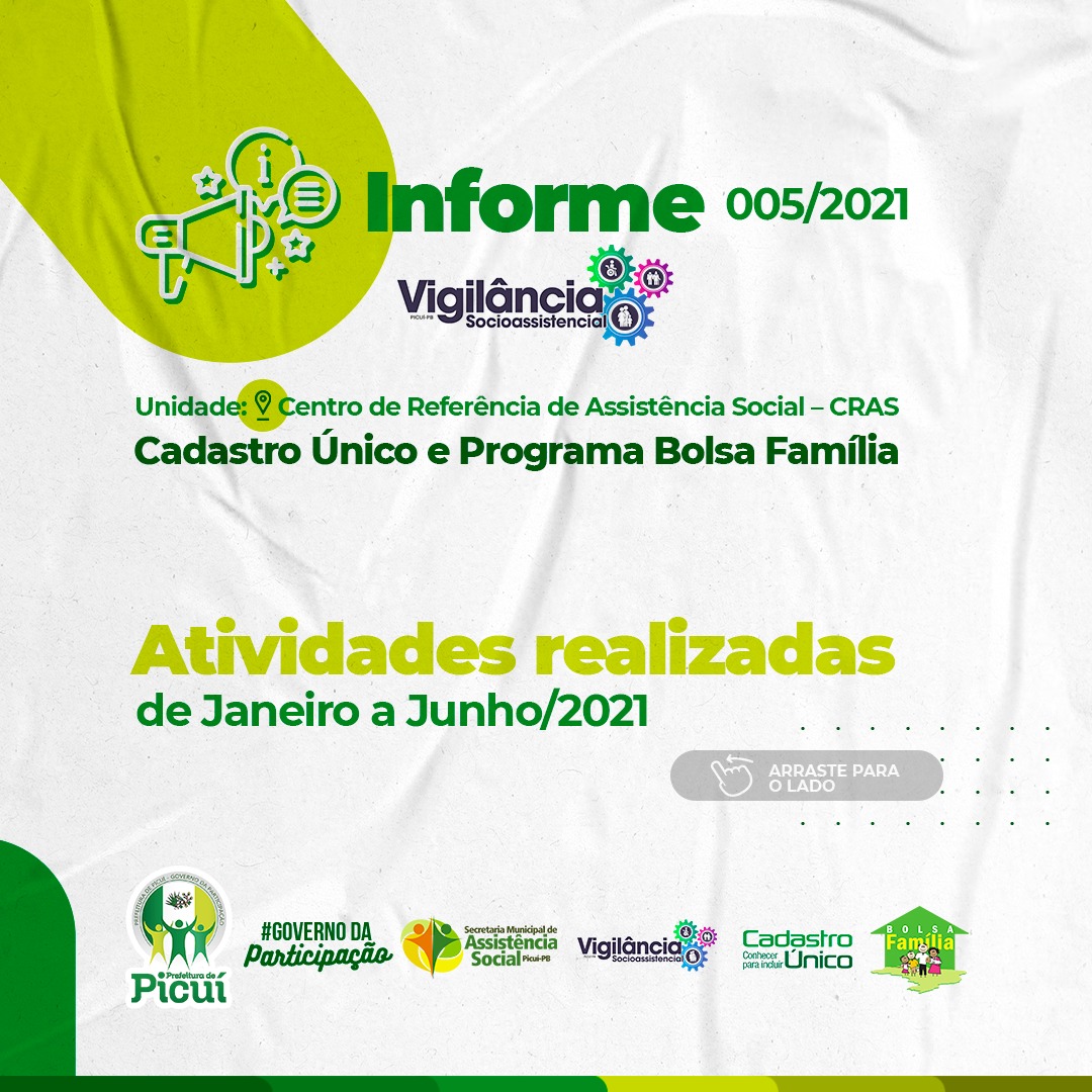 No primeiro semestre de 2021, a Secretaria de Assistência Social tem desenvolvido uma série de atividades e trabalhos em prol da população picuiense, especialmente através do Centro de Referência da Assistência Social - (CRAS), referente às atividades realizadas pelo Cadastro Único e Programa Bolsa Família.