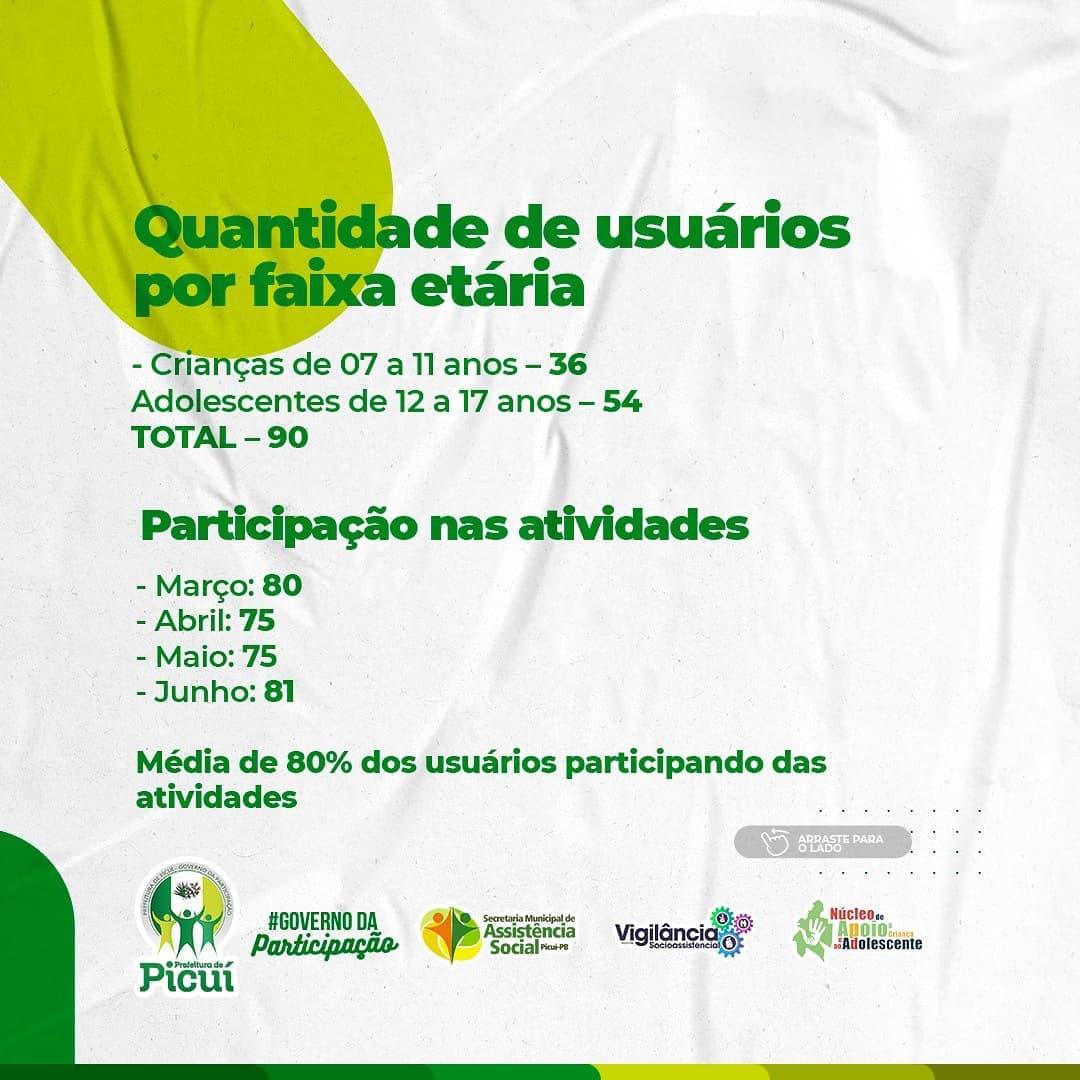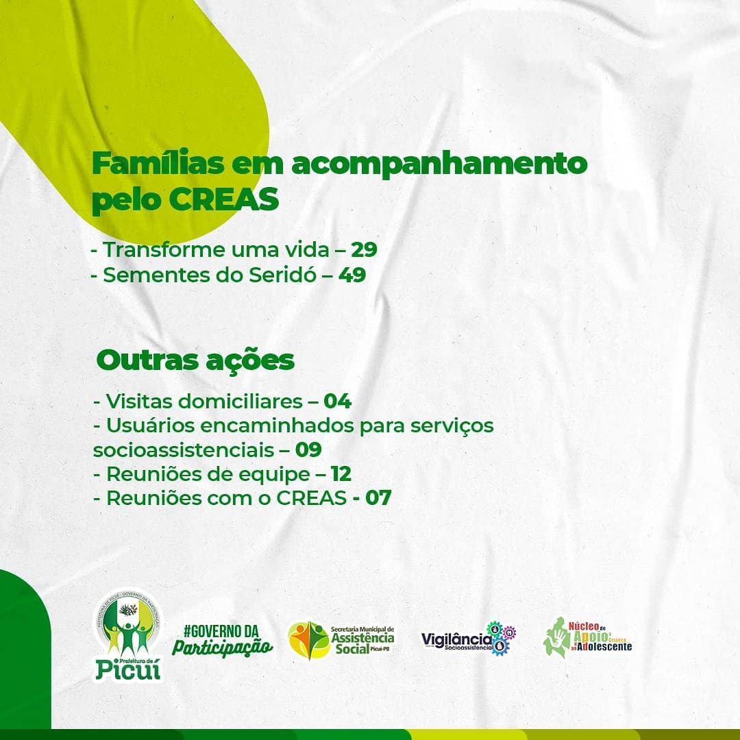 No primeiro semestre de 2021, a Secretaria de Assistência Social tem desenvolvido uma série de atividades e trabalhos em prol da população picuiense, especialmente através do Centro de Referência Especializado da Assistência Social - (CREAS), referente às atividades realizadas pelo Núcleo de Apoio à Criança e ao Adolescente (NACAD).