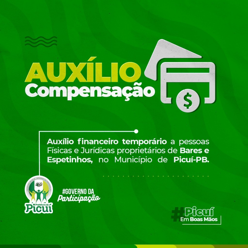 A Prefeitura Municipal de Picuí, nos termos da Lei n° 1.887/2021, torna público que estão abertas as inscrições para recebimento de auxílio financeiro emergencial aos proprietários de bares e espetinhos de Picuí-PB, mediante as regras a seguir estabelecidas: