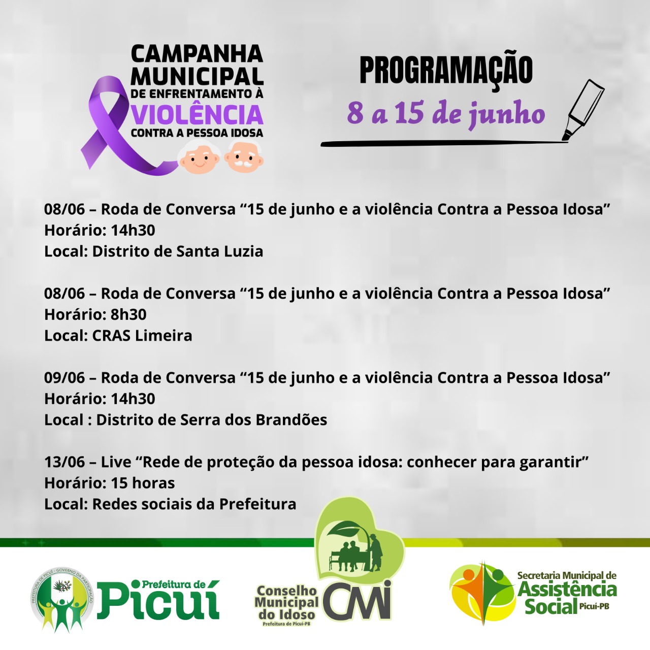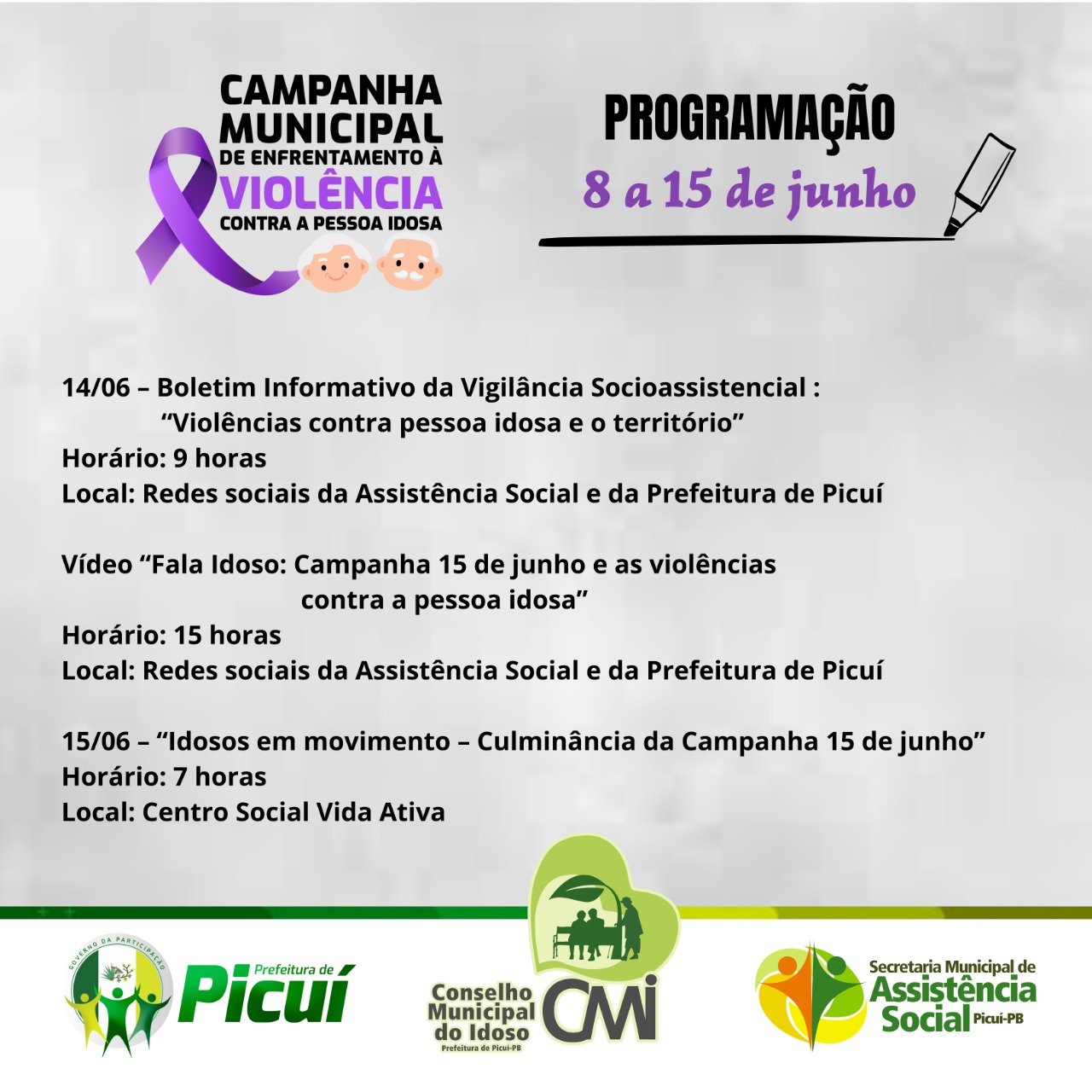 Em alusão ao dia 15 de junho, Dia Mundial de Conscientização da Violência contra a Pessoa Idosa, a Prefeitura de Picuí - Governo da Participação II, por meio da Secretaria de Assistência Social, está promovendo a Campanha Junho Violeta na conscientização pelo combate à violência contra os idosos.