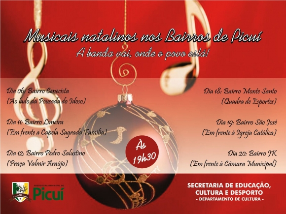 A Prefeitura Municipal de Picuí, através do Departamento de Cultura, realiza durante o mês de dezembro musicais natalinos nos bairros da cidade. Ao todo, serão realizadas seis apresentações da Banda Filarmônica Coronel Antônio Xavier de Macedo.