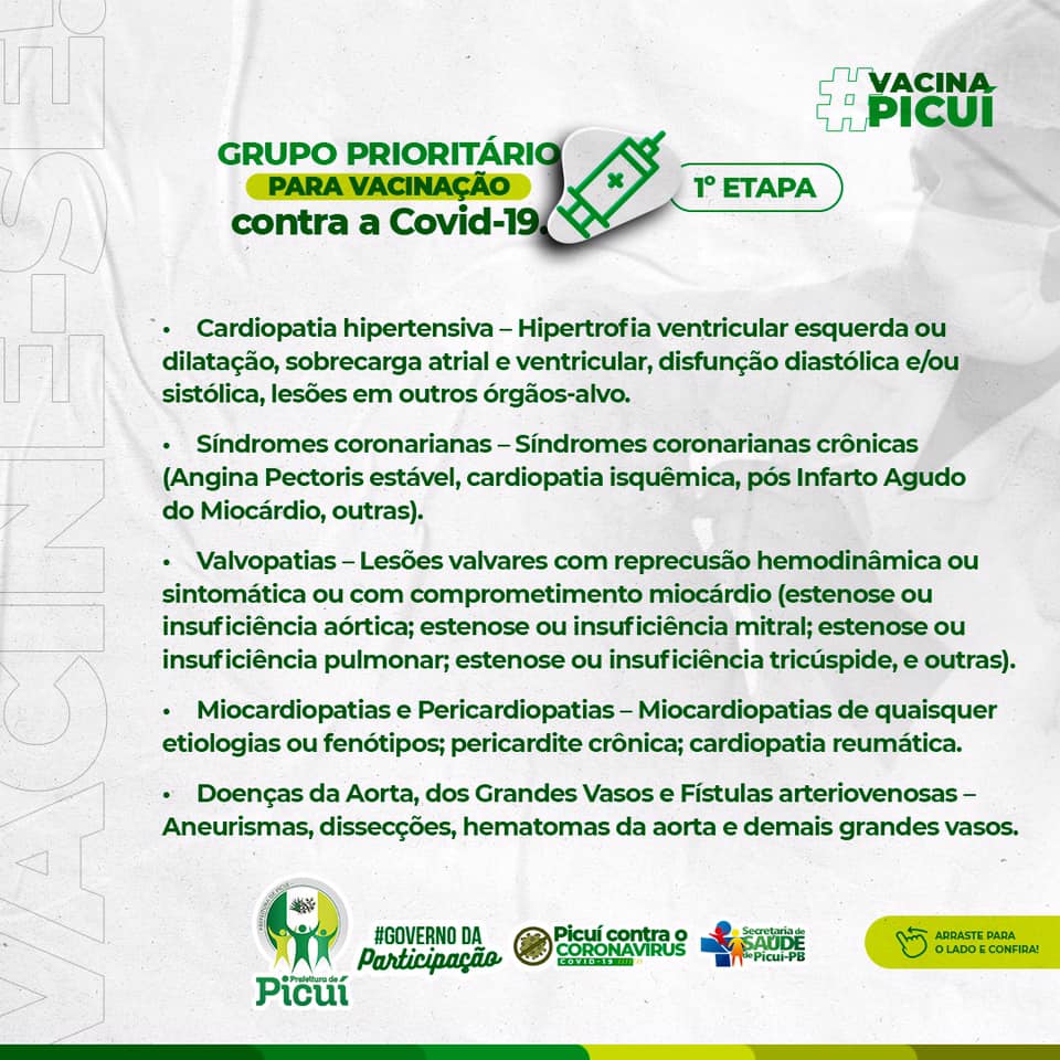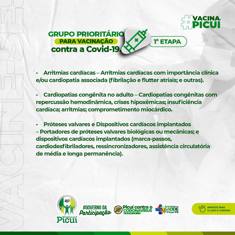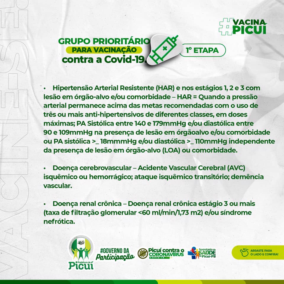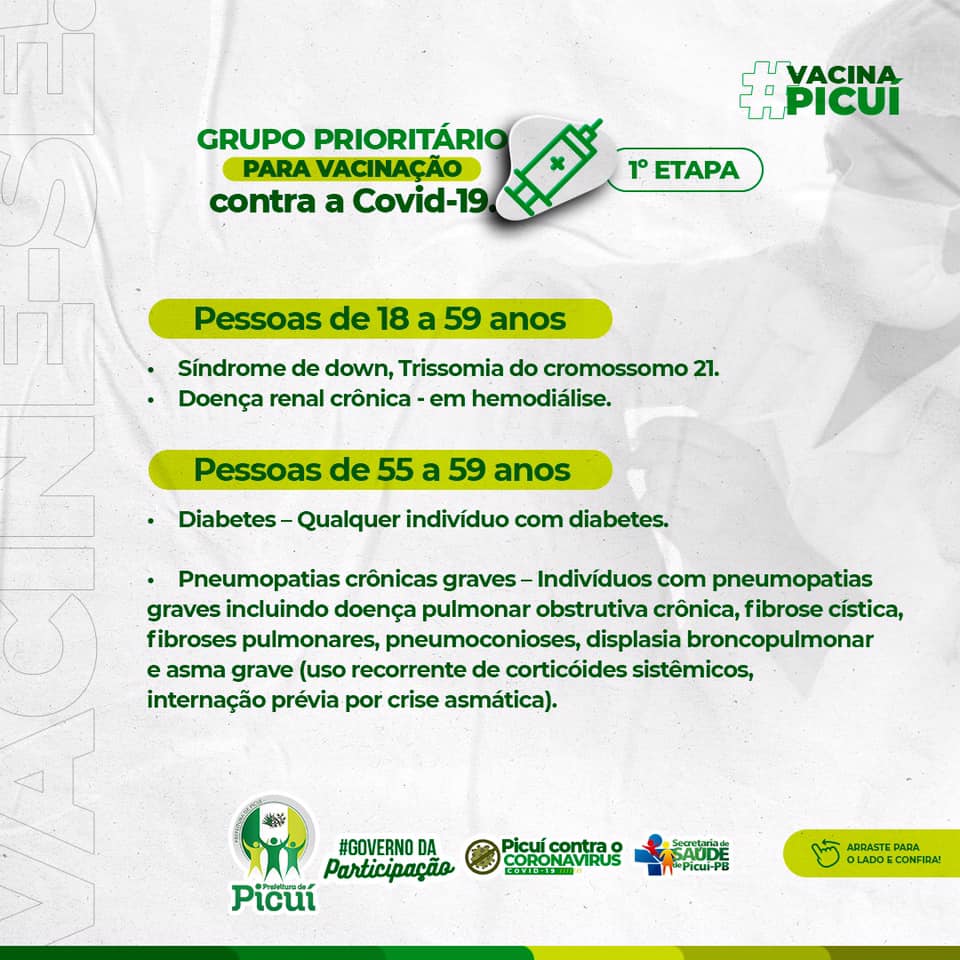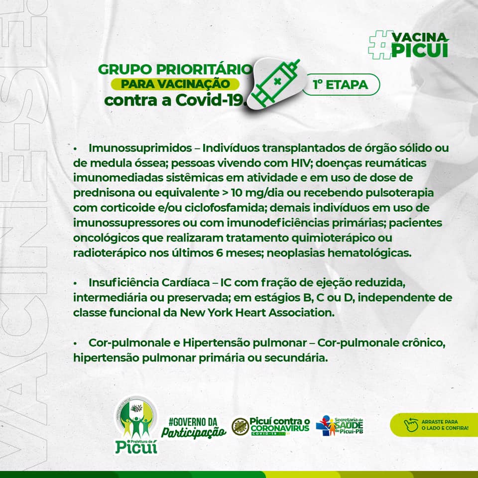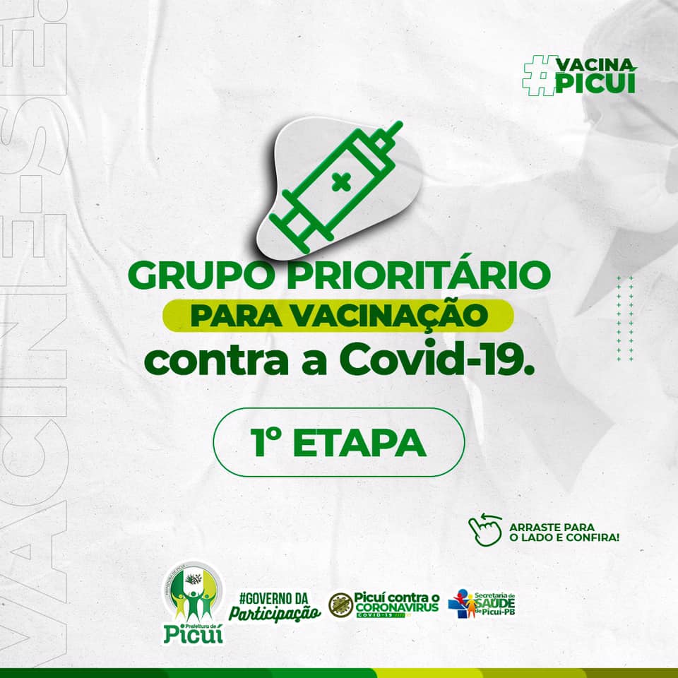 Vale ressaltar que se faz necessário e importante que as pessoas que se enquadrem nos públicos prioritários possam portar, no momento da vacinação, o laudo médico comprovando, bem como também o cartão do SUS e a identidade. Em Picuí, mais 15% da população tem sido vacinada, até então, o que é consideravelmente positivo na luta no combate à COVID-19. É importante destacar que os cuidados com o uso da máscara de proteção, bem como a higienização das mãos e o distanciamento social devem ser mantidos pela segurança e saúde de todos os munícipes.