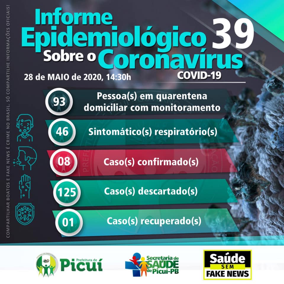 O município de Picuí registra, no dia de hoje (28), o oitavo caso confirmado de COVID-19. 1 paciente está totalmente recuperado e cerca de 93 pessoas seguem em isolamento domiciliar com o monitoramento das Equipes de Estratégia de Saúde da Família.