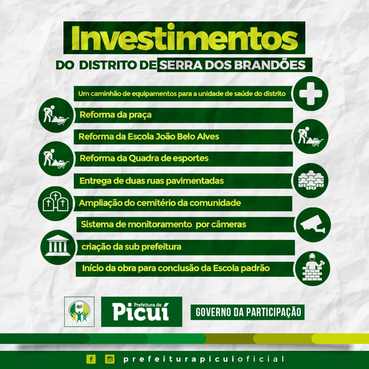 O prefeito de Picuí Olivânio Remígio (PT), usou seu perfil no facebook, para fazer vários anúncios de interesse público, nesta quarta-feira (28). O início das obras de construção do sistema de dessalinização de água das comunidades Vertentes e Poço de Onça. Segundo o prefeito, o investimento é fruto de parceria entre o município de Picuí e o Governo do Estado, por meio do Procase. A ação faz parte do programa municipal Campo Sustentável.