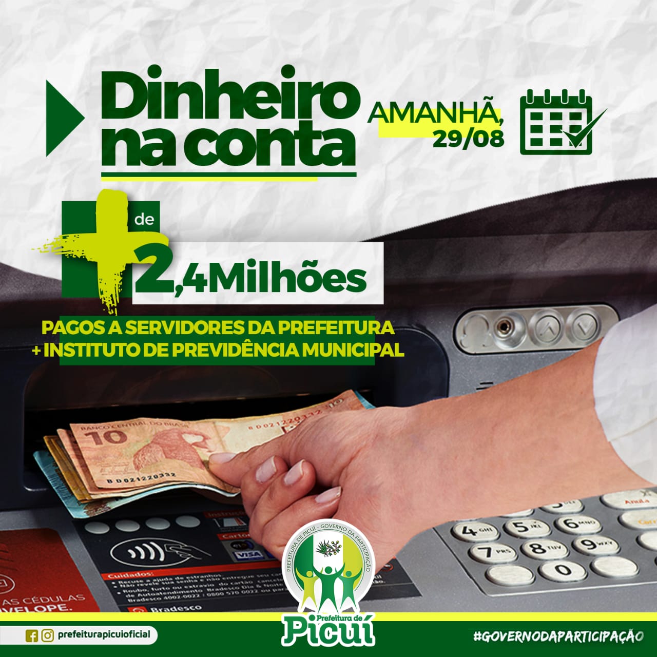 Para encerrar o dia, Olivânio anunciou para esta quinta-feira (29), o pagamento do funcionalismo público municipal, aposentados e pensionistas do Instituto de Previdência Municipal. Segundo o anuncio, o valor supera dois milhões e quatrocentos mil reais, que estará circulando na economia local. “Informamos que amanhã, após ao meio dia, já tem dinheiro nas contas. Nosso trabalho é contínuo” - enfatizou.