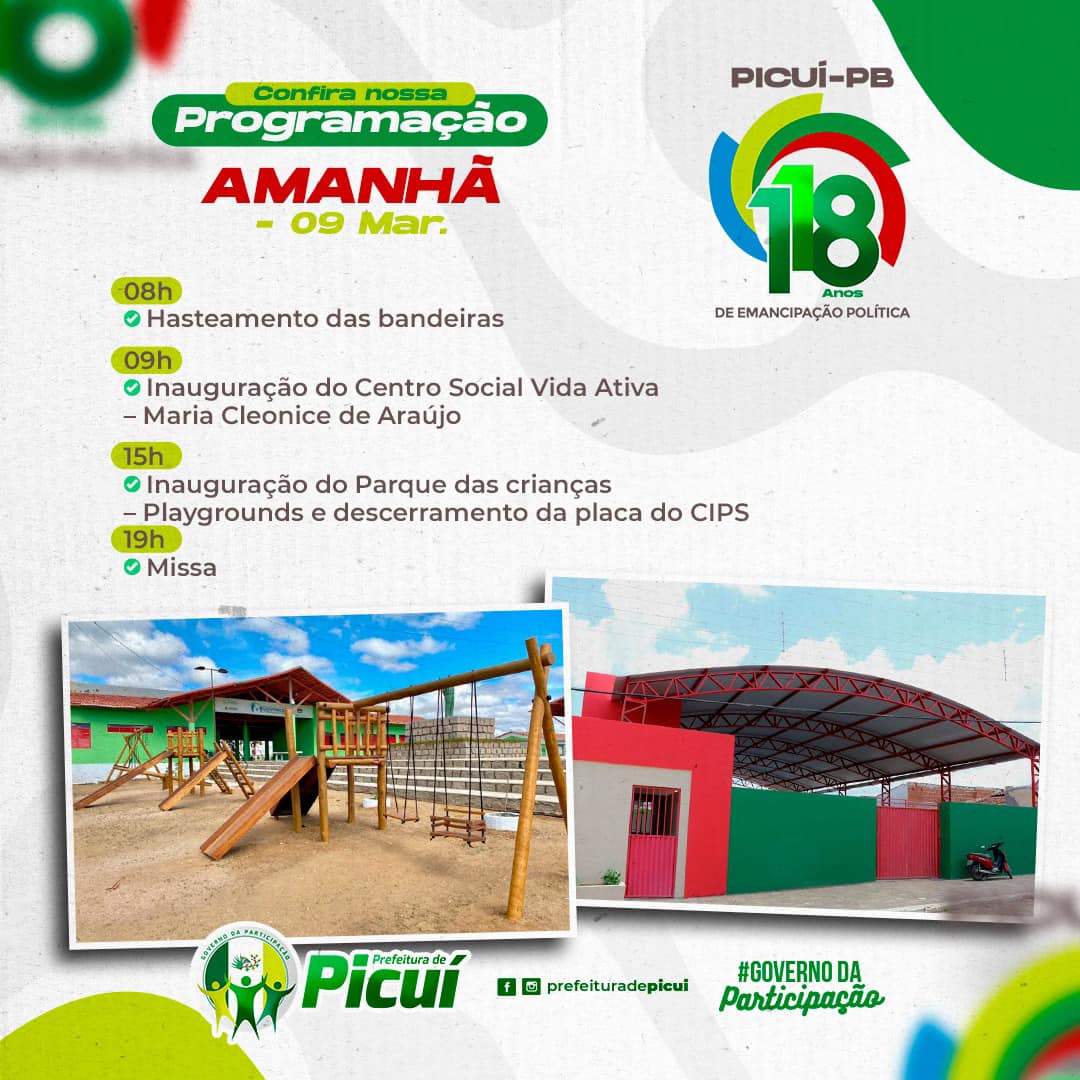 A Prefeitura Municipal de Picuí convida toda população para participar da programação que se estenderá até o dia 27 de março com entregas de obras e inaugurações por todo o município.