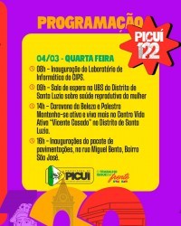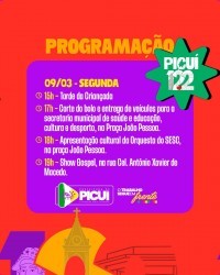 O município de Picuí se prepara para celebrar seus 122 anos de Emancipação Política com uma programação ampla e diversificada, que une ações voltadas à saúde, cultura, esporte, infraestrutura, fé e cidadania. De 02 a 22 de março, a cidade vivenciará dias intensos de atividades que reforçam o compromisso com o desenvolvimento e a valorização da população.