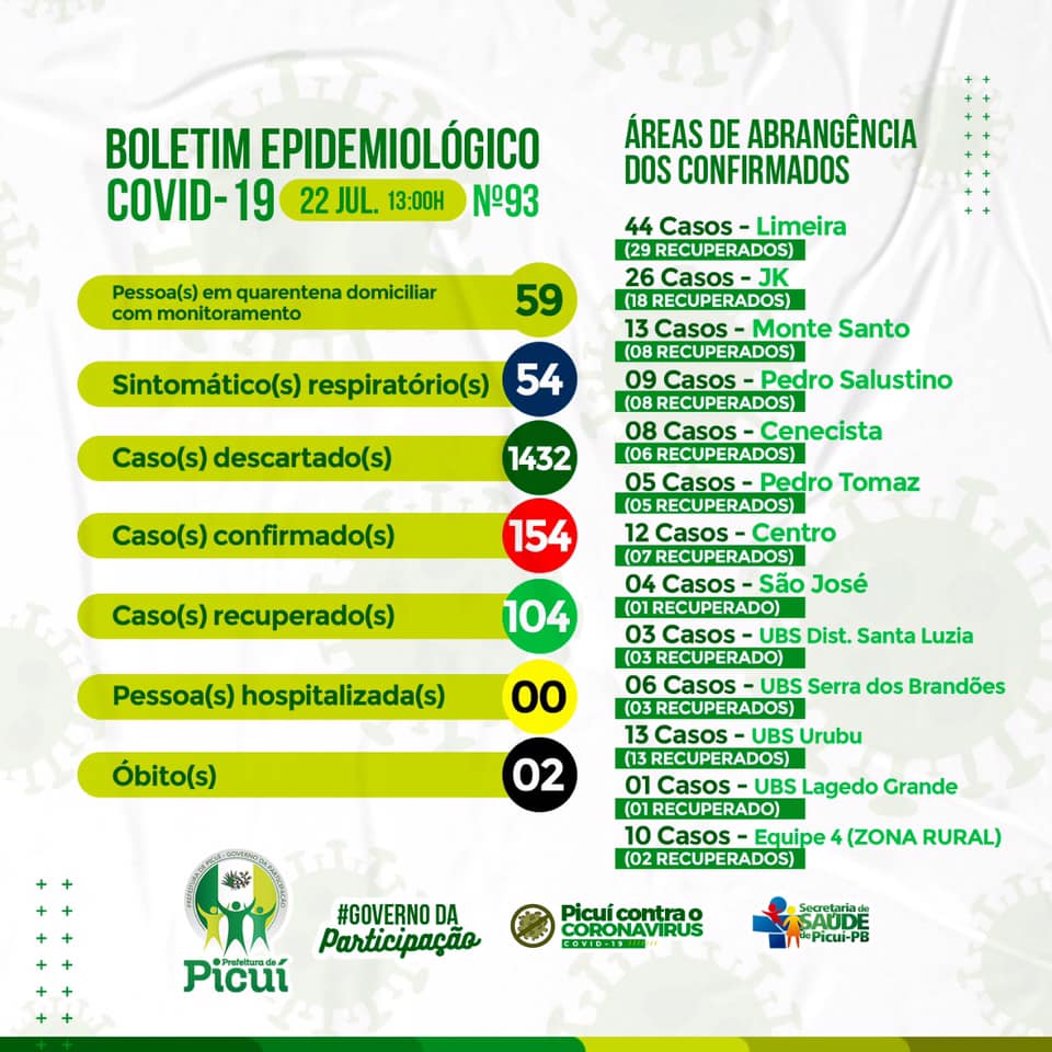 De acordo com informações fornecidas pela Vigilância Epidemiológica, Picuí registra, nesta quarta-feira (22), 154 casos confirmados, no total, e há cerca de 104 pessoas que estão recuperadas da doença. 59 pessoas estão em quarentena domiciliar com o monitoramento das Equipes de Estratégia de Saúde da Família e cerca de 54 casos estão sintomáticos respiratórios (síndrome gripal) com os sintomas defebre, coriza, tosse, dor de garganta e que foram registrados pelas equipes de saúde. 1432 casos foram descartados a partir dos resultados apresentados na realização do teste rápido com os profissionais de saúde, servidores públicos e/ou pessoas que apresentaram algum sintoma gripal. No início deste mês, Picuí teve dois óbitos por COVID-19.