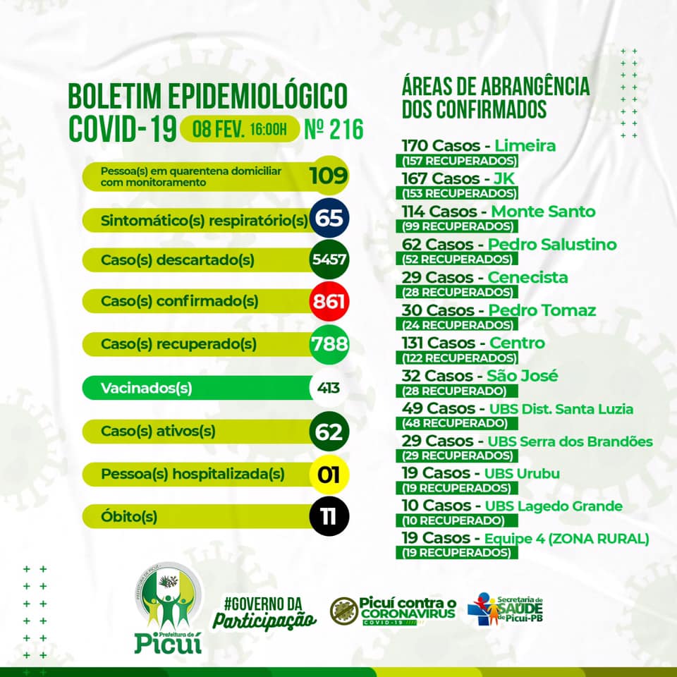 De acordo com informações fornecidas pela Vigilância Epidemiológica, Picuí registra nesta segunda-feira (08/02), 861 casos confirmados, sendo 62 ativos, e há cerca de 788 pessoas que estão recuperadas da doença.