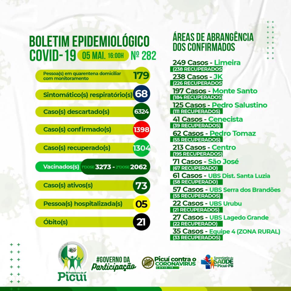 De acordo com informações fornecidas pela Vigilância Epidemiológica, Picuí registra nesta quarta-feira(05), 1398 casos confirmados, sendo 73 ativos, e há cerca de 1304 pessoas que estão recuperadas da doença.
