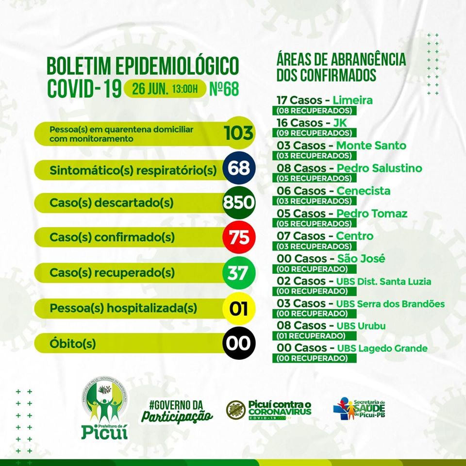 De acordo com informações fornecidas pela Vigilância Epidemiológica, o município de Picuí registra, no dia de hoje (26/06), 75 casos confirmados, no total, e há cerca de 37 pessoas que estão recuperadas da doença. 103 pessoas estão em quarentena domiciliar com o monitoramento das Equipes de Estratégia de Saúde da Família e cerca de 68 casos estão sintomáticos respiratórios (síndrome gripal) com os sintomas de febre, coriza, tosse, dorde garganta e que foram registrados pelas equipes de saúde. 850 casos foram descartados a partir dos resultados apresentados na realização do teste rápido com os profissionais de saúde, servidores públicos e/ou pessoas que apresentaram algum sintoma gripal e uma pessoa encontra-se hospitalizada. O município não registrou nenhum óbito da doença.