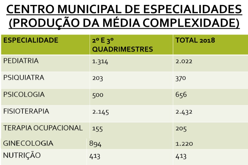 De acordo com os dados, em 2018 foram realizados atendimentos de pediatria (2.022), psiquiatria (370), psicologia (656), fisioterapia (2.432), terapia ocupacional (205), ginecologia (1.220) e nutrição (413).