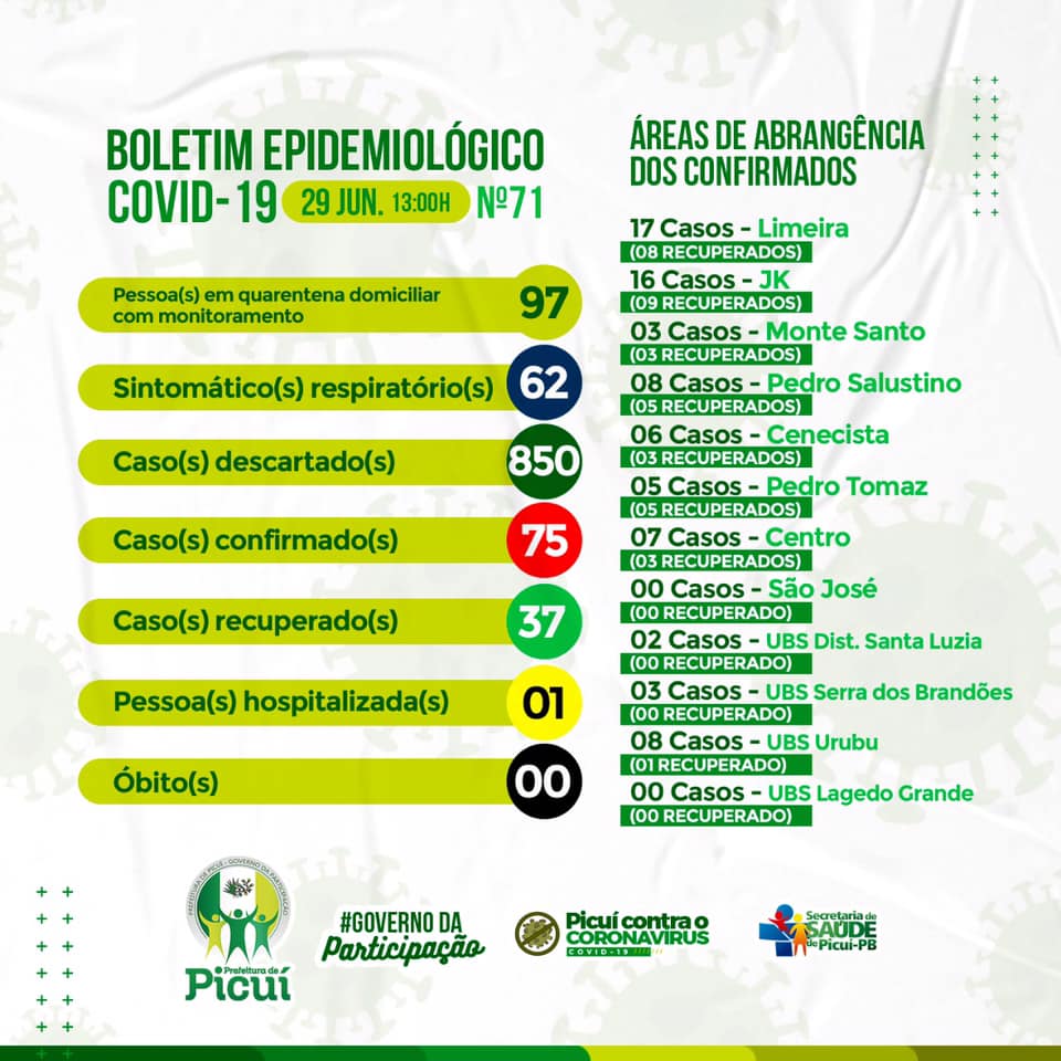 O município de Picuí segue, no dia de hoje (29/06), com 75 casos confirmados, no total, e há cerca de 37 pessoas que estão recuperadas da doença. 97 pessoas estão em quarentena domiciliar com o monitoramento das Equipes de Estratégia de Saúde da Família e cerca de 62 casos estão sintomáticos respiratórios (síndrome gripal) com os sintomas de febre, coriza, tosse, dor de garganta e que foram registrados pelas equipes de saúde. 850 casos foram descartados a partir dos resultados apresentados na realização do teste rápido com os profissionais de saúde, servidores públicos e/ou pessoas que apresentaram algum sintoma gripal e uma pessoa encontra-se hospitalizada. O município não registrou nenhum óbito da doença.