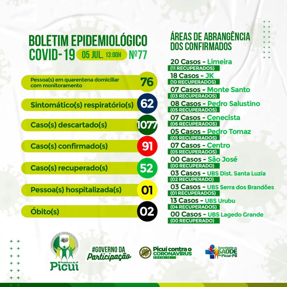 De acordo com informações fornecidas pela Vigilância Epidemiológica, Picuí segue, no dia de hoje (05/07), com 91 casos confirmados, no total, e há cerca de 52 pessoas que estão recuperadas da doença.