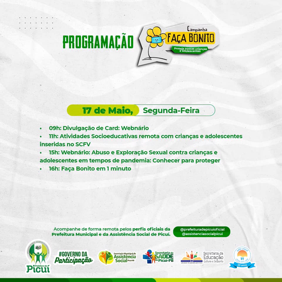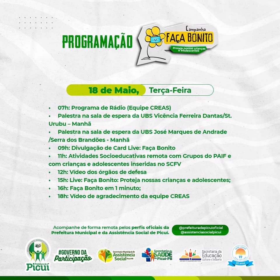 Neste ano, o município de Picuí, levando em consideração o contexto de pandemia da COVID-19, realizará ações exclusivamente online, por meio do Centro de Referência Especializado da Assistência Social, em que terá por finalidade mobilizar, sensibilizar, informar e convocar a sociedade para reflexão acerca da temática, através de convidados da rede de proteção do município de Picuí.