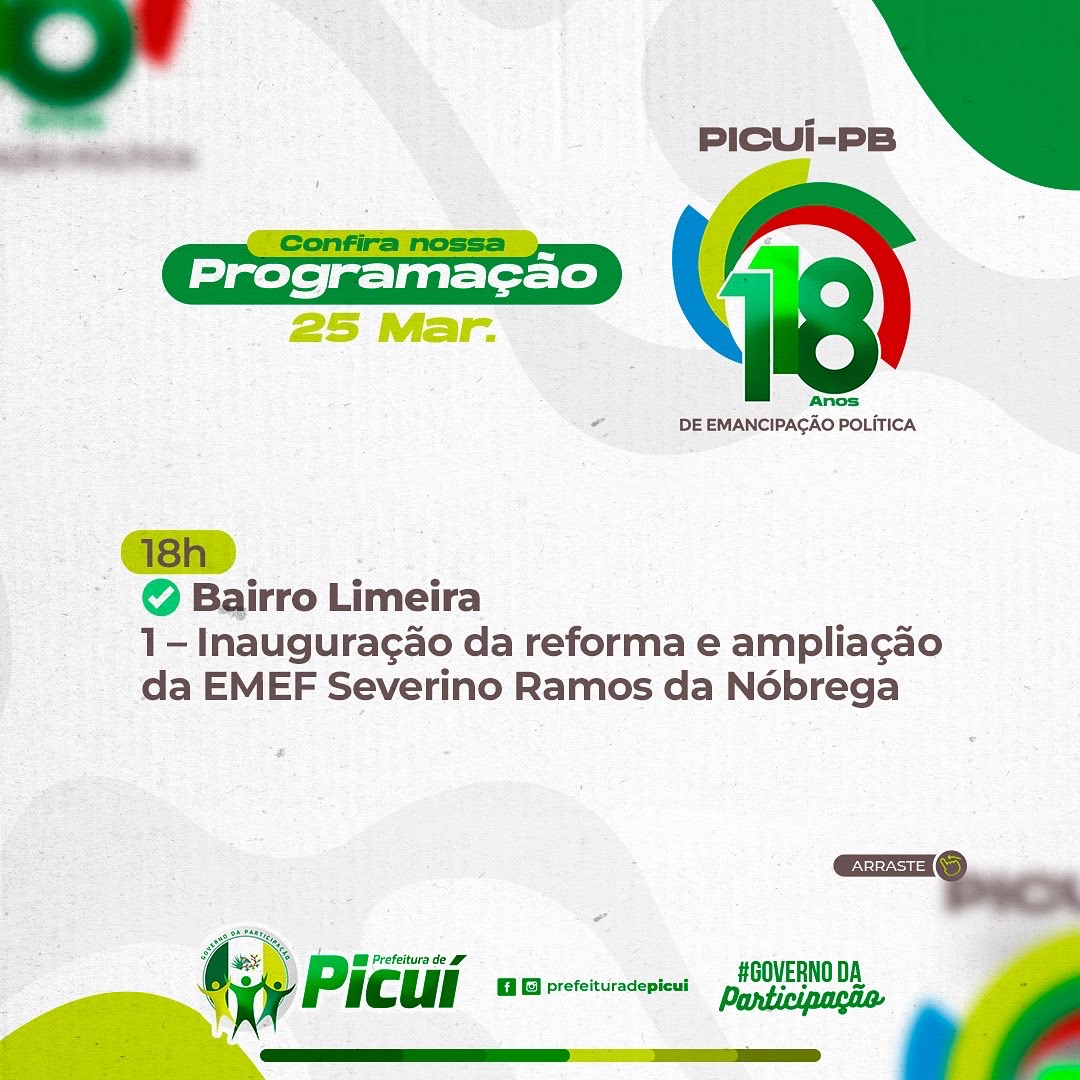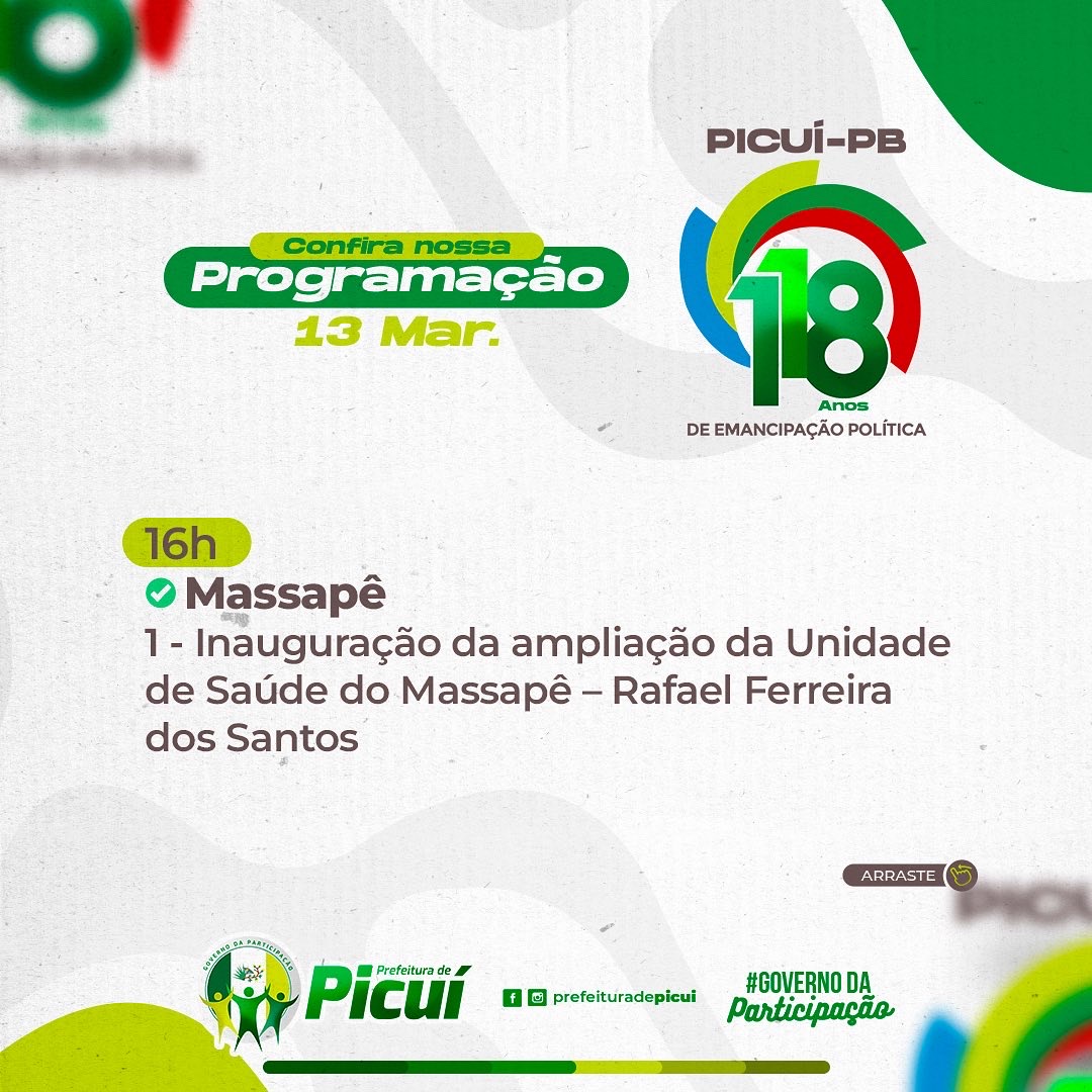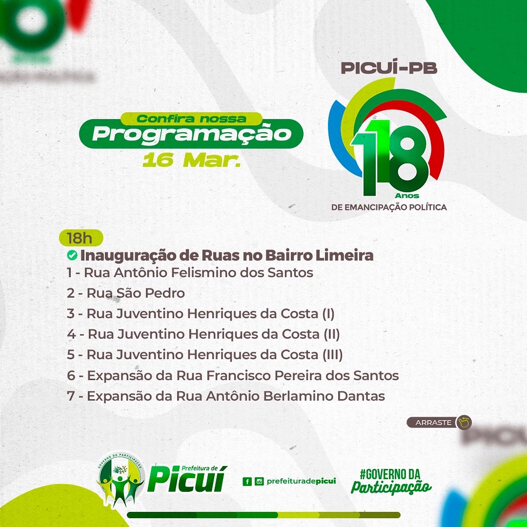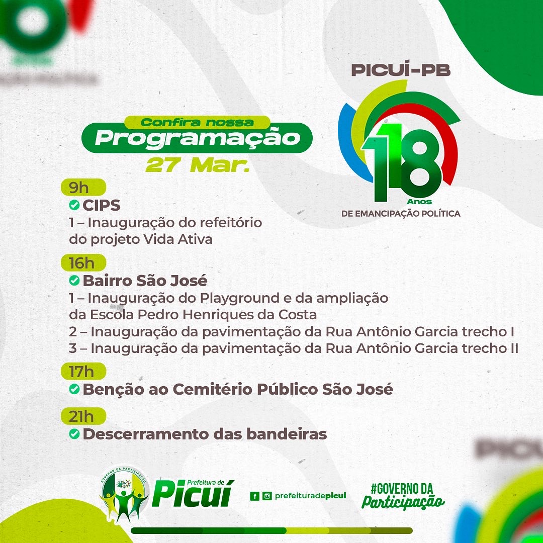 O prefeito Olivânio destacou que serão mais de 5 milhões de reais investidos em obras, equipamentos e serviços em prol da população picuiense que serão entregues, ao longo deste mês. “Dedicarei o mês de março às inaugurações de obras diversas e de equipamentos urbanos que custarão aos cofres públicos municipais mais de 5 milhões de reais de investimentos, levando-se em conta que a Prefeitura tem uma contrapartida razoável, no registro dos contratos,” explicou Olivânio. “Tenho a certeza de que, com esse rol de obras, os picuienses serão presenteados em grande estilo.”