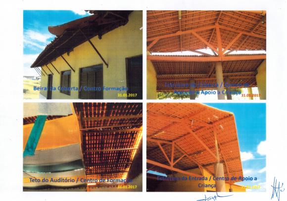 Dentre as irregularidades encontradas, verificou-se que, no auditório, todo o forro de gesso desabou e todas as tesouras de madeira que servem de apoio, bem como a distribuição de cargas de telhado, estão \"flambadas\". Ademais, as paredes laterais, localizadas na entrada do auditório, estão fora de prumo.