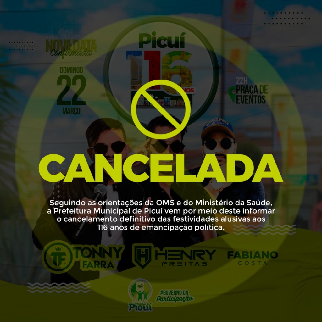 A Prefeitura Municipal de Picuí, através do Governo da Participação, vem a público comunicar oficialmente o cancelamento definitivo da Festa em alusão aos 116 anos de Emancipação Política do município, em virtude do Decreto nº 560/2020, de 17 de março de 2020, estabelecendo diretrizes quanto ao funcionamento das repartições públicas da Administração Municipal durante o período de 18 a 31 de março de 2020 e dá outra providências.