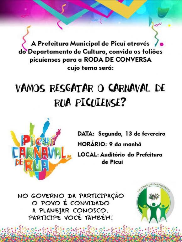 A Prefeitura Municipal de Picuí, através do departamento de Cultura, está convidando agitadores de blocos carnavalescos e foliões para uma reunião que acontecerá nesta segunda-feira (13) às 9h no auditório municipal.