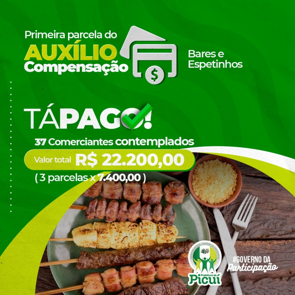 A Prefeitura Municipal de Picuí - Governo da Participação II, através da Secretaria de Assistência Social, e da Lei Municipal 1.887/2021, está destinando um auxílio financeiro emergencial aos proprietários de bares e espetinhos localizados no município, que foram consideravelmente prejudicados com a pandemia do novo coronavírus, já que estes estabelecimentos tiveram que parar com suas atividades comerciais nesse período. O valor destinado será de 600 reais, divididos em 3 parcelas de 200 reais.
