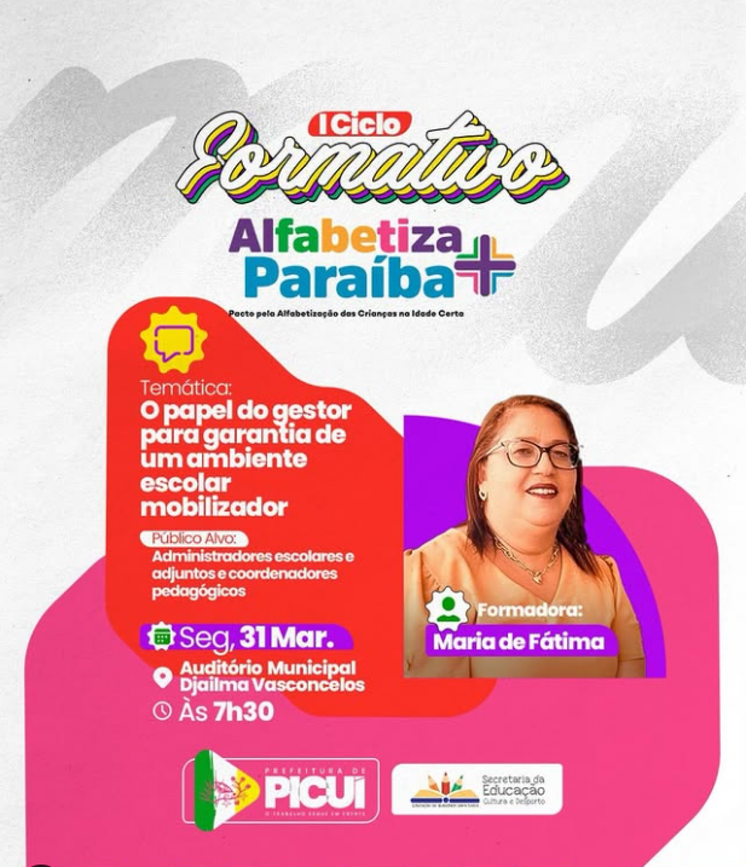 A Prefeitura de Picuí, por meio da Secretaria de Educação, Cultura e Desporto, realizará na próxima segunda-feira, 31 de março, o 1º Ciclo Formativo do Programa Alfabetiza Paraíba. O evento acontecerá no Auditório Municipal Djalma de Lima Vasconcelos, a partir das 7h30, reunindo administradores escolares, adjuntos e coordenadores pedagógicos da rede municipal de ensino.