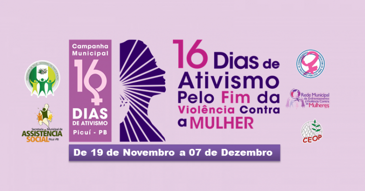 A Prefeitura Municipal de Picuí, através da Secretaria de Assistência Social, promove de 19 de novembro a 07 de dezembro a Campanha 16 Dias de Ativismo pelo Fim da Violência contra a Mulher, conforme a seguinte programação: