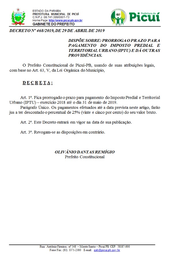 A Prefeitura de Picuí divulgou hoje o decreto 468/2019 em que prorroga o prazo de desconto para o pagamento do IPTU no exercício de 2018. O Imposto Predial Territorial Urbano (IPTU), está com desconto de 25% do valor bruto do que está sendo cobrado. O decreto dá também a validade de prorrogação até o dia 31 de maio deste ano.