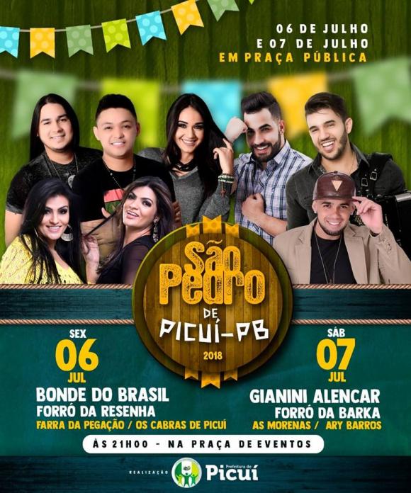 A Prefeitura de Picuí, contando como programação do Circuito Junino 2018, estará realizando nos dias 06 e 07 de julho a tradicional festa de São Pedro com grandes atrações para animar os forrozeiros que aproveitam o período para se divertir.