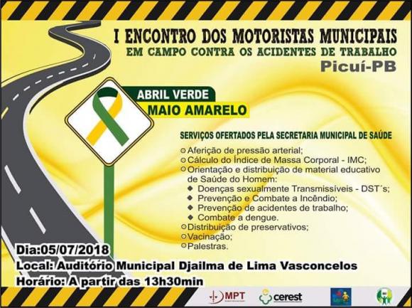 A Prefeitura de Picuí, por meio da Secretaria Municipal de Saúde de Picuí, através da Vigilância em Saúde do Trabalhador, Ministério Público do Trabalho – MPT e o Centro de Referência Regional em Saúde do Trabalhador de Campina Grande – CEREST- estará realizando o I Encontro Dos Motoristas Municipais: Em Campo Contra Acidentes De Trabalho, que será realizado nesta quinta-feira (05), a partir 13h30min, no Auditório Djalma de Lima Vasconcelos, localizado à Rua Antônio Firmino, 344, Bairro Monte Santo - Centro Administrativo Municipal.